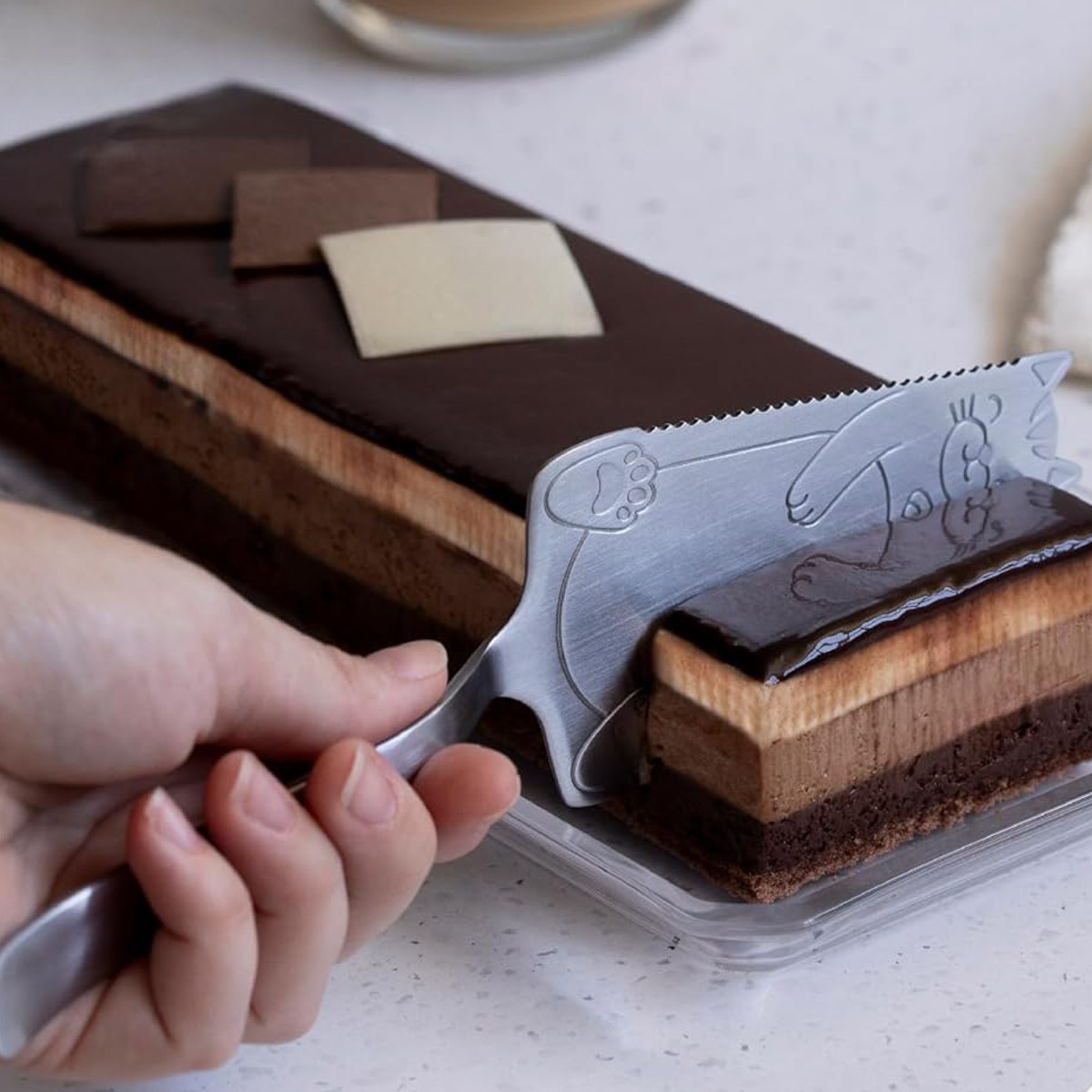 しっぽがハンドルになったネコちゃんのケーキカッターです。ギザギザの面で切って、そのままサービングできます。よりケーキが楽しめそうなニコニコ笑顔もポイントです。