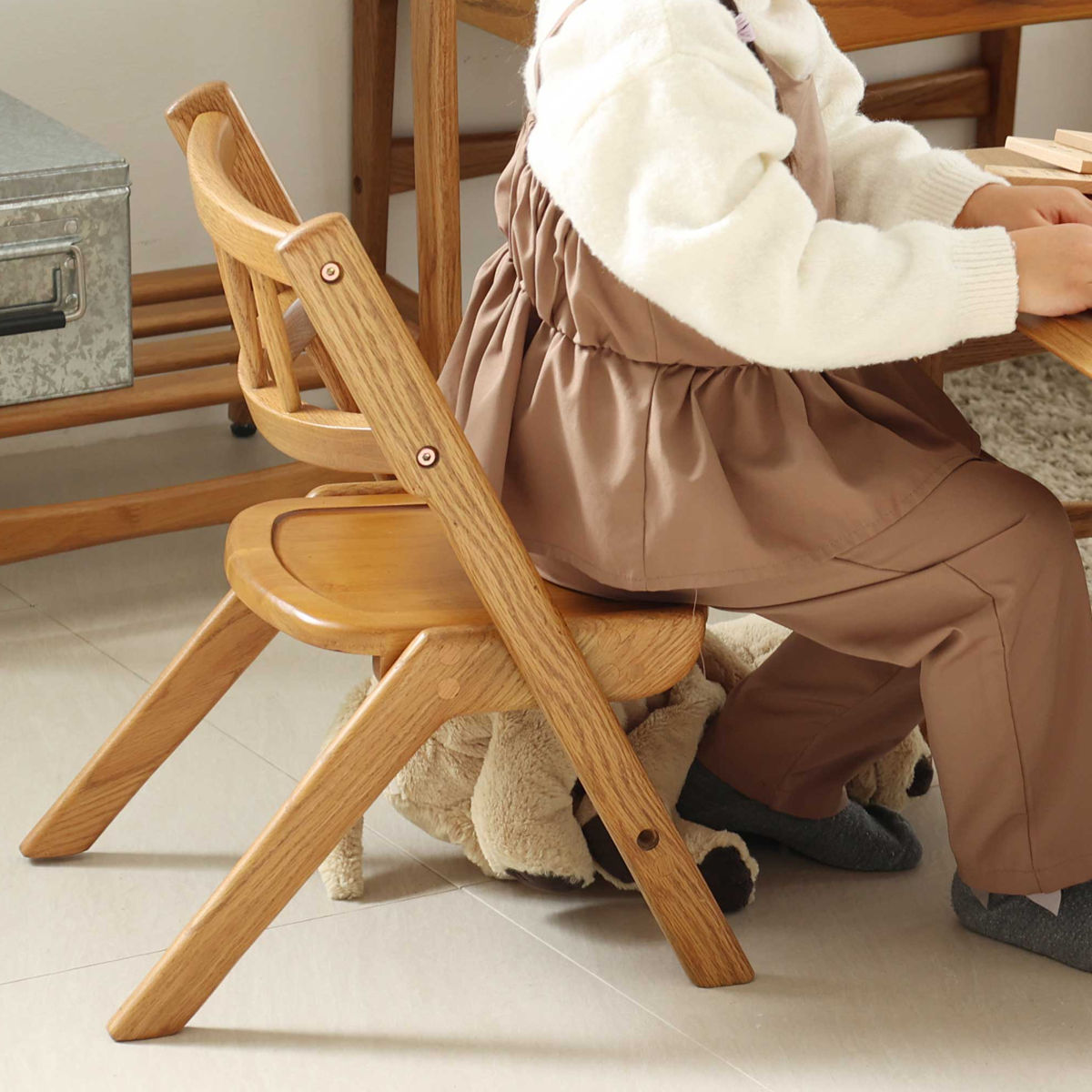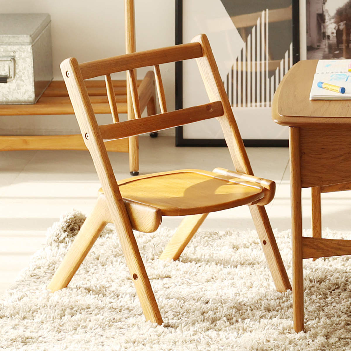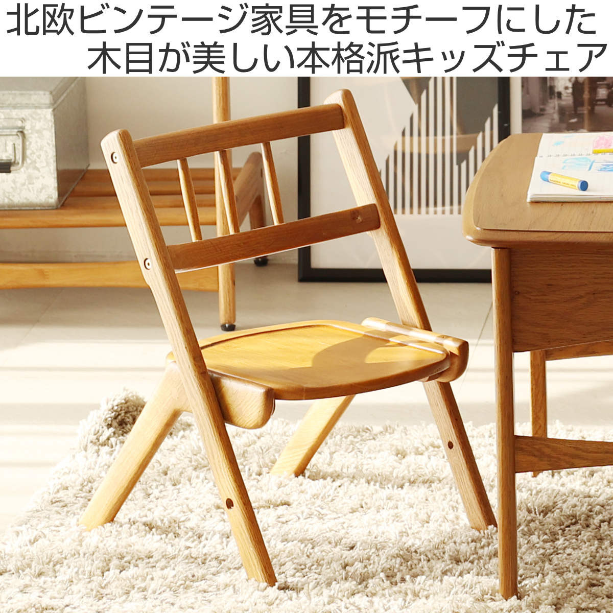 1960年代の北欧ビンテージ家具をモチーフにした、上質感あふれるキッズチェアです。天然木のあたたかみある佇まいで、子ども部屋はもちろん、リビングにも自然と溶け込みます。