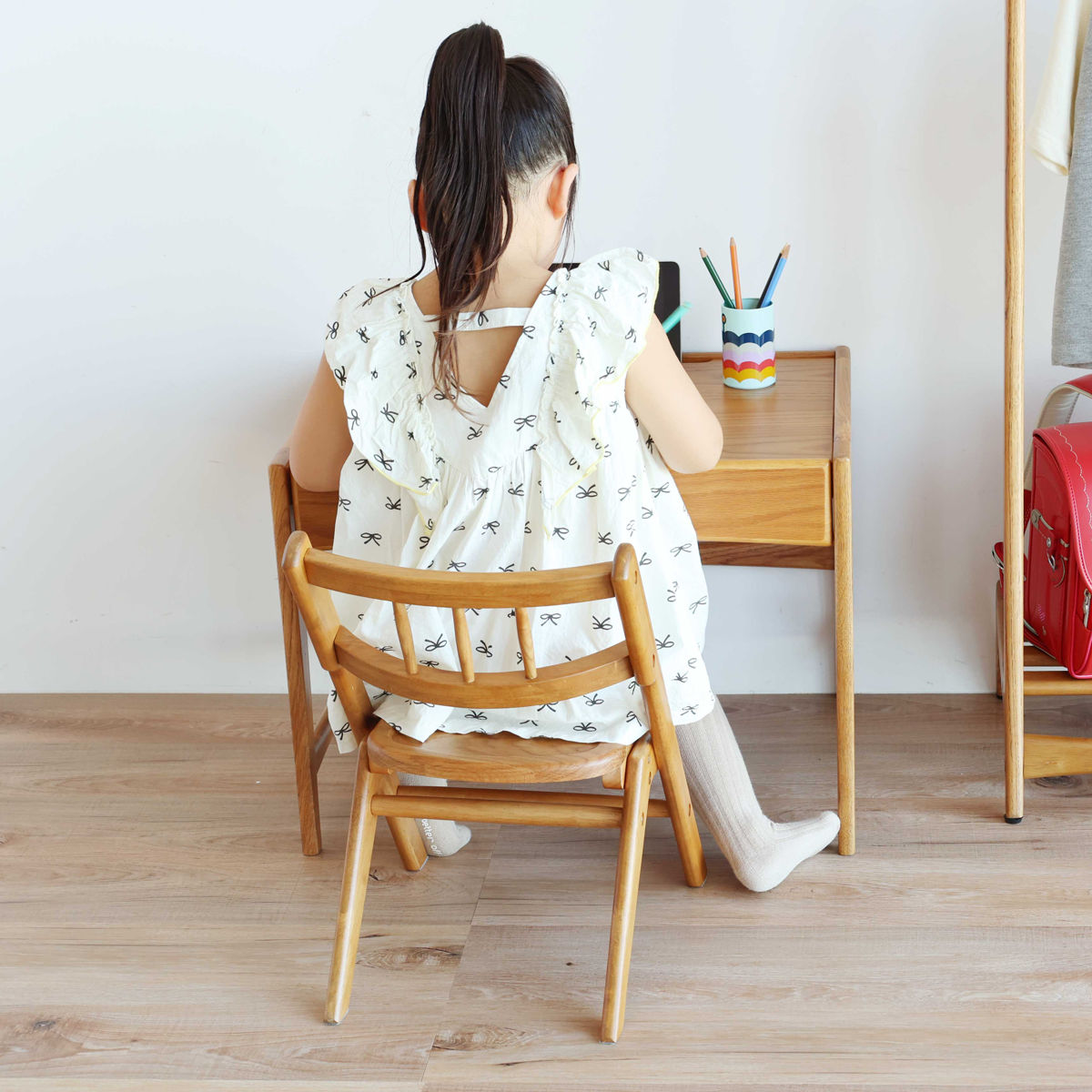 桟や背もたれフレームにはラバーウッド材を使用。直線とやわらかなラインを組み合わせたフォルムが美しく、大人の家具とも調和するデザインです。空間全体をやさしい雰囲気に整えます。