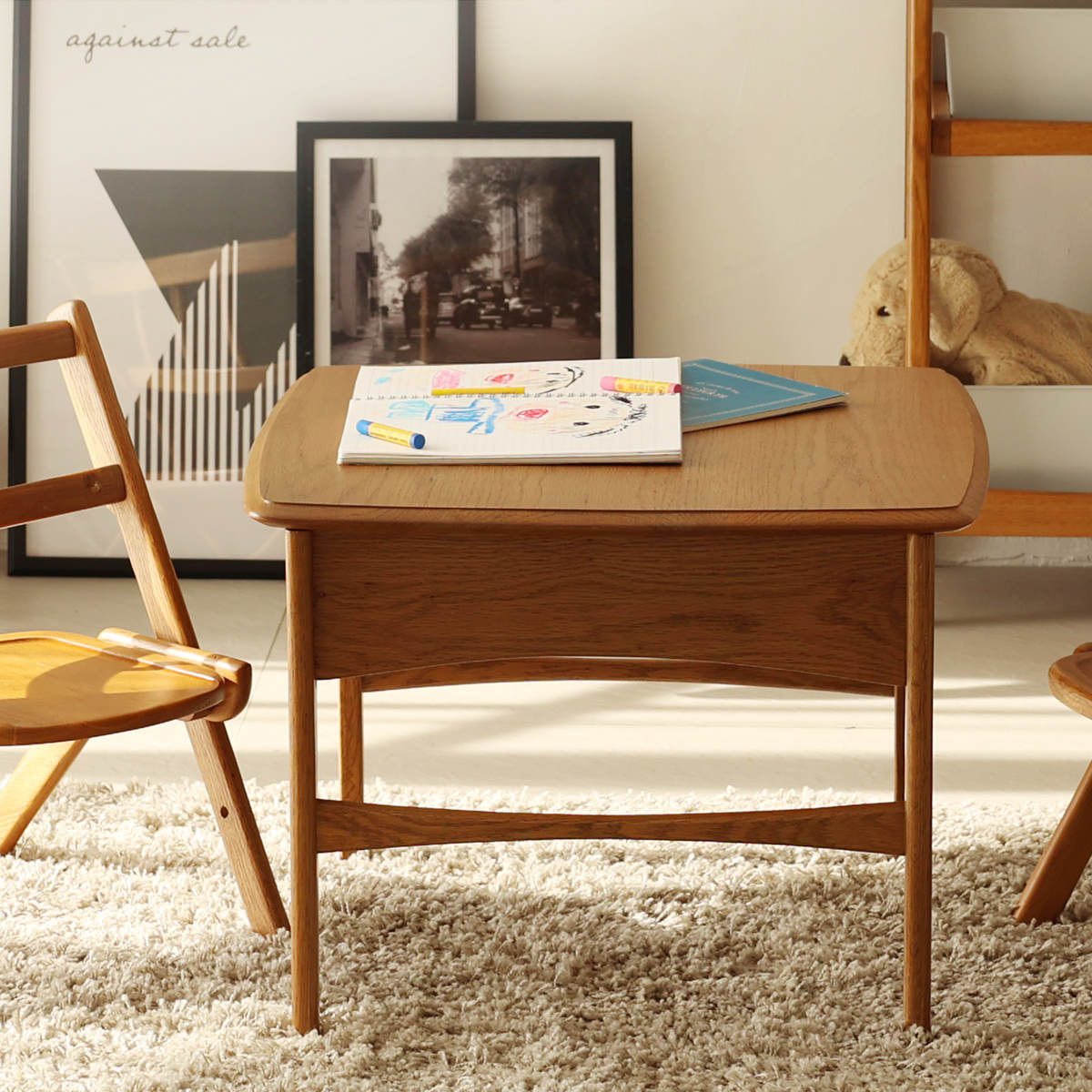天板や脚部にはオーク無垢材を贅沢に使用した折りたたみ式学習机です。使うほどに味わいが深まる天然木の風合いが、お子さまの暮らしにやさしく寄り添います。