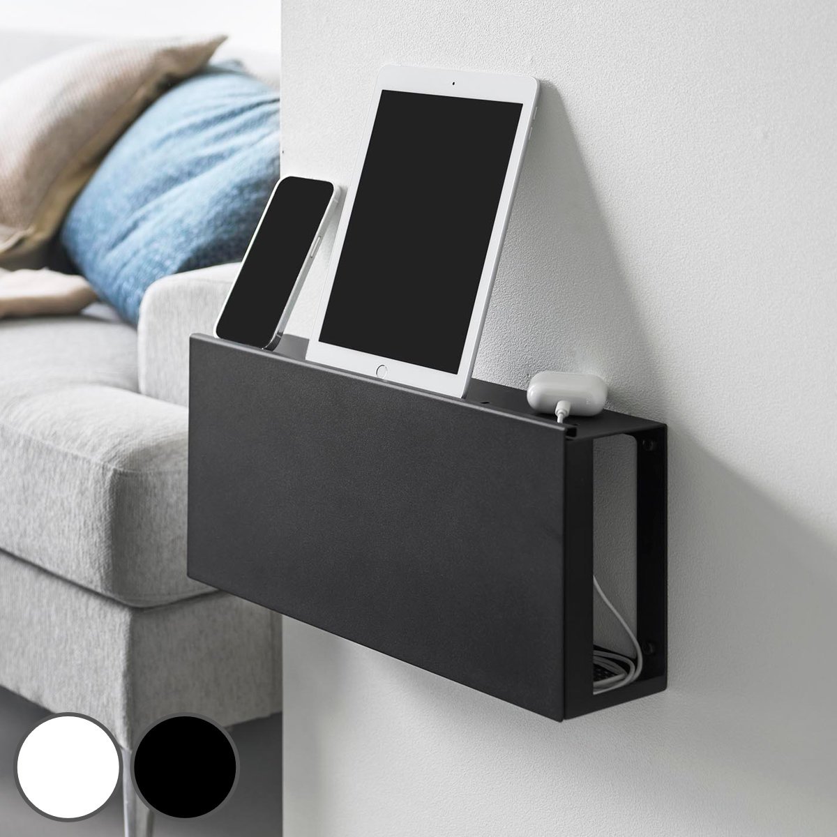 置き場所に困るルーターやケーブルを、コンセントごとすっきり隠して収納できる壁付けラックです。天面は小物置きとしても活用できます。