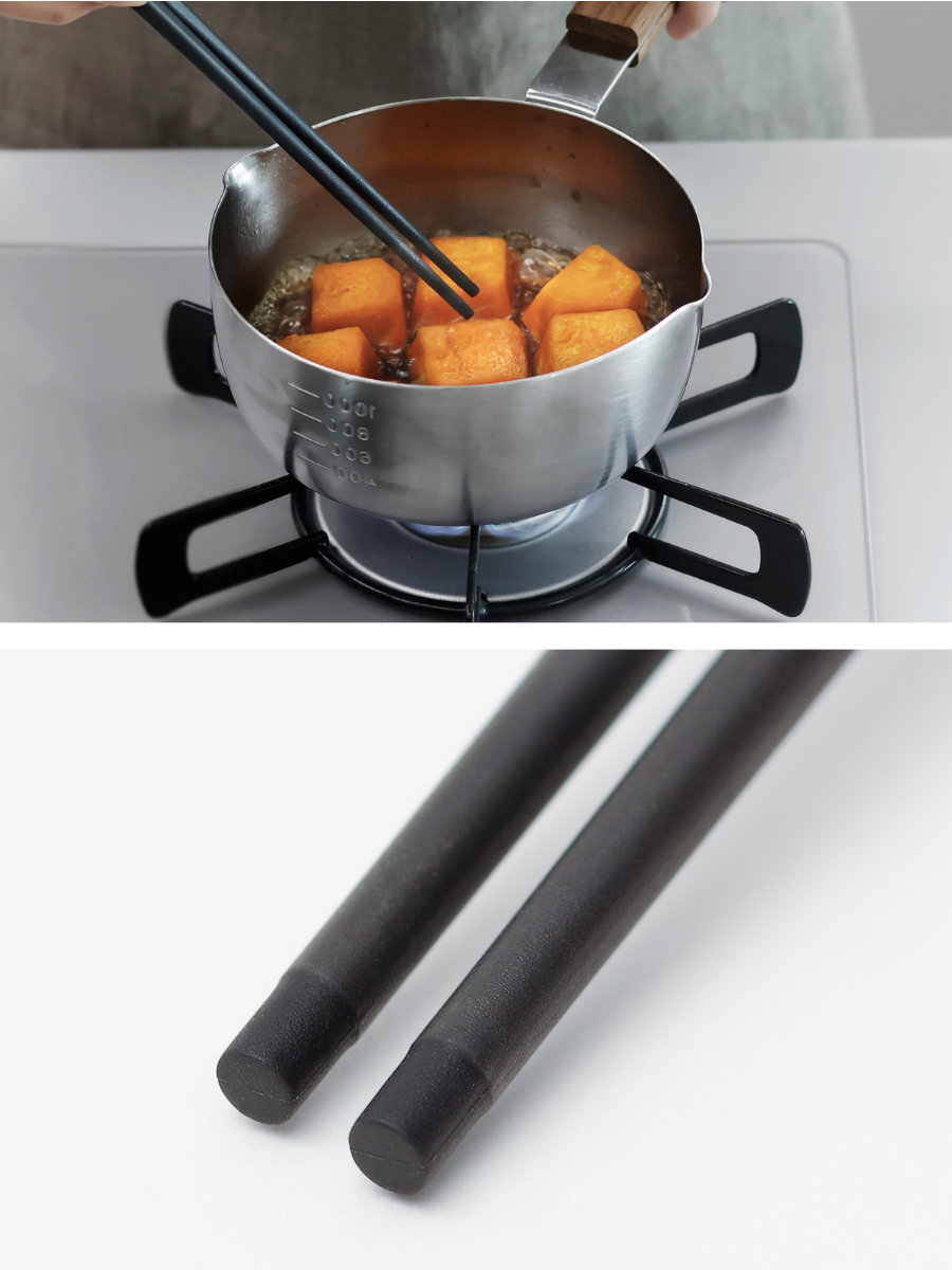 丸みのある四角形から先端に向かって円形へと変化するグラデーション形状を採用。調理台に置いても転がりにくく安定感があり、指にやさしくフィットして細かな動きもスムーズに行えます。また、箸同士が絡みにくい設計です。