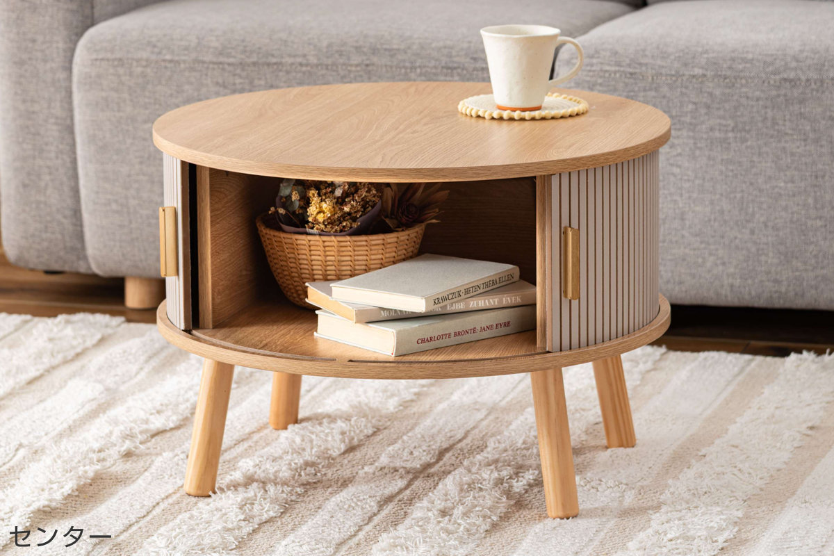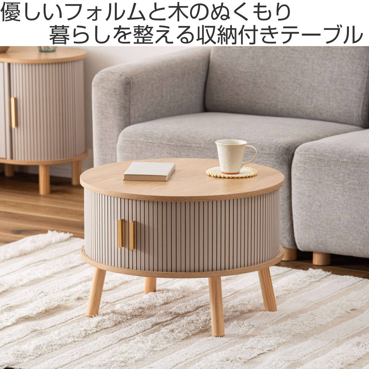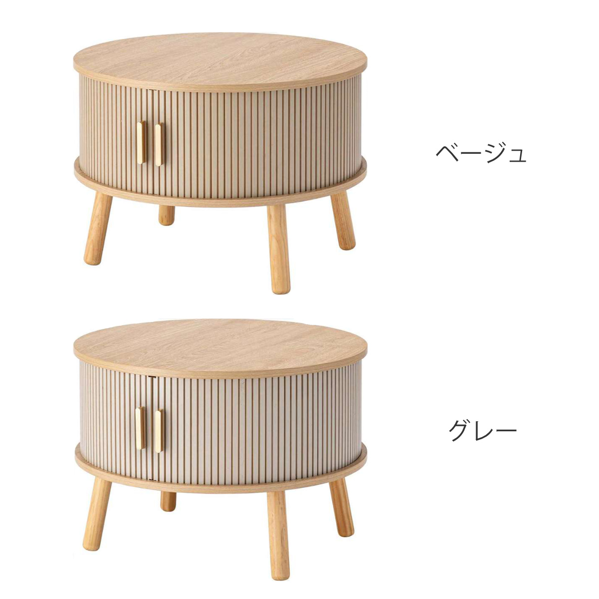 ローテーブル 直径58cm 円形 収納付き じゃばら式スライド扉 ( テーブル 机 丸 センターテーブル 収納 扉付き リビングテーブル 丸テーブル )