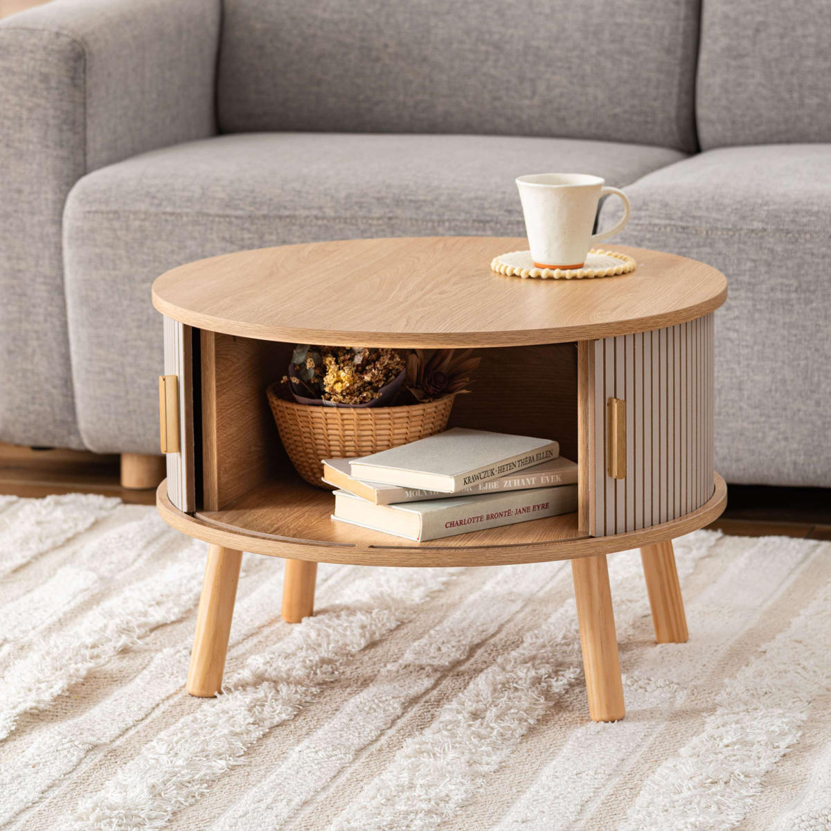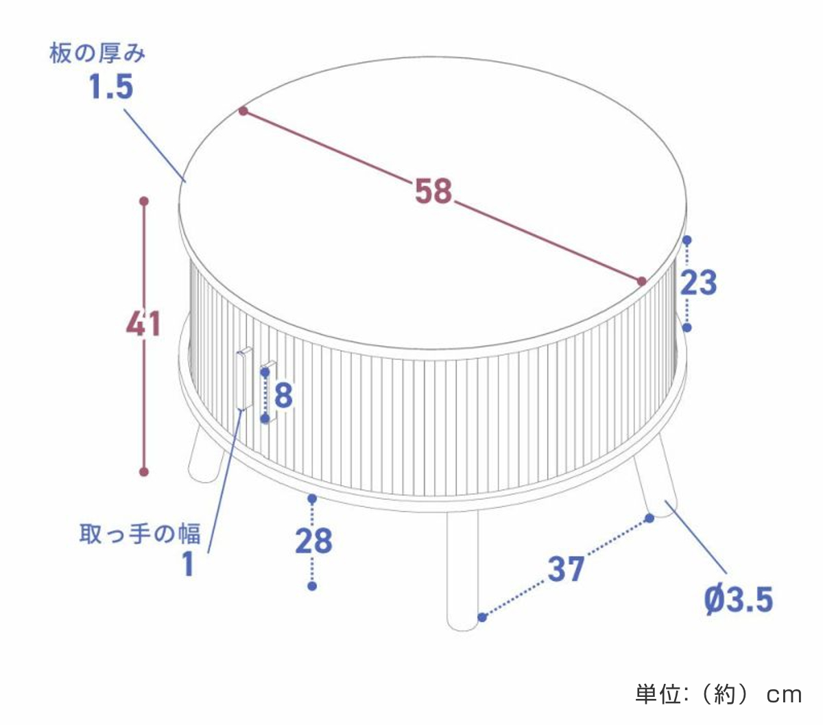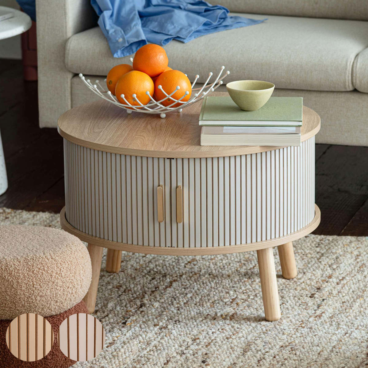 ローテーブル 直径58cm 円形 収納付き じゃばら式スライド扉 ( テーブル 机 丸 センターテーブル 収納 扉付き リビングテーブル 丸テーブル )