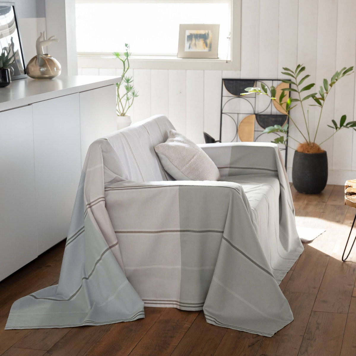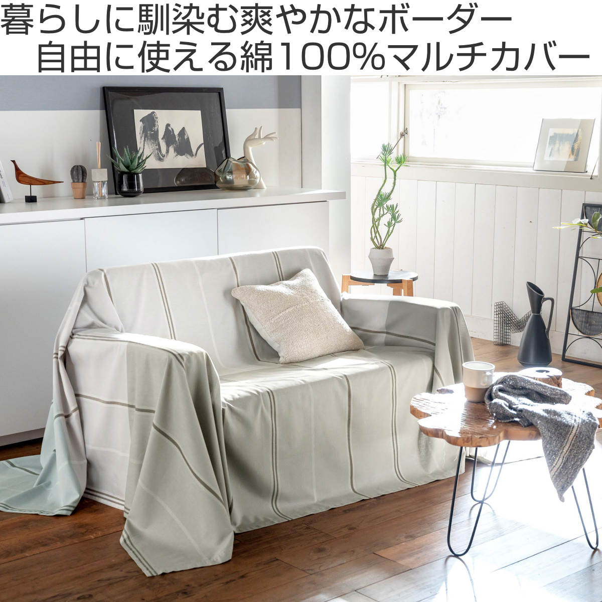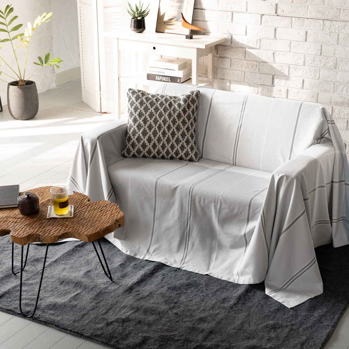 シンプルで使いやすいデザインなので、ソファカバーとしてはもちろん、ベッドカバーやベッドスプレッドなどさまざまな用途でお使いいただけます。掛けるだけでお部屋の印象を手軽に変えることができ、シーンやインテリアに合わせて自由に楽しめるマルチカバーです。
