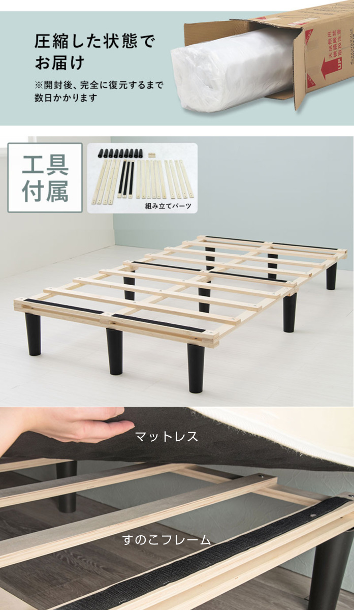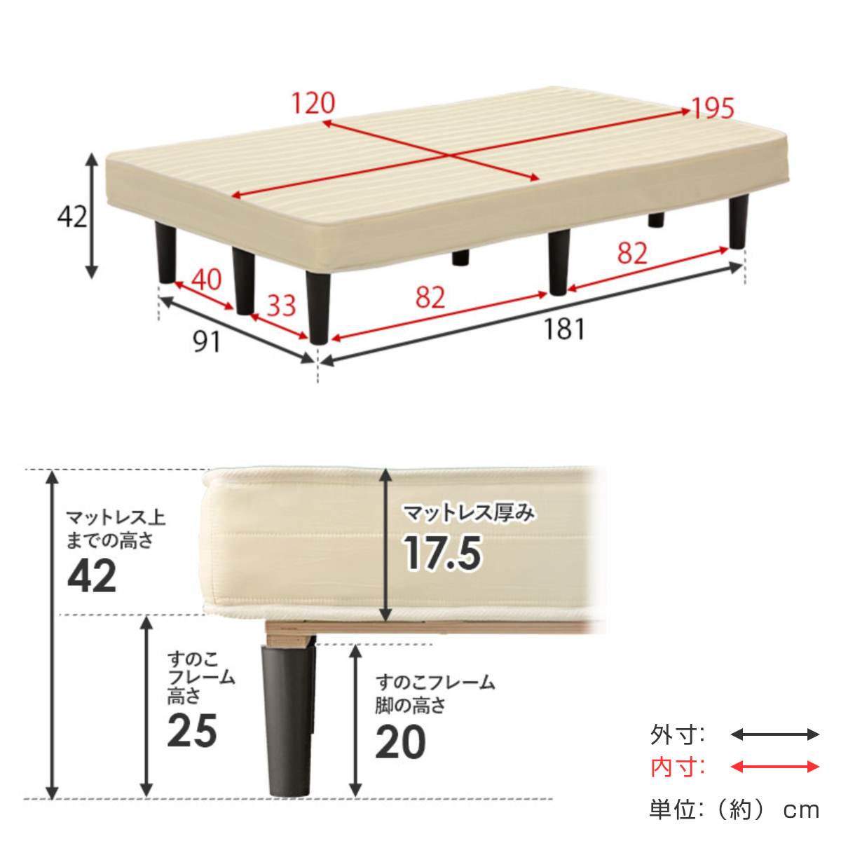 | サイズ | 約 幅120×奥行195×高さ42(cm) マットレス:約 幅120×奥行195×高さ17.5(cm) |