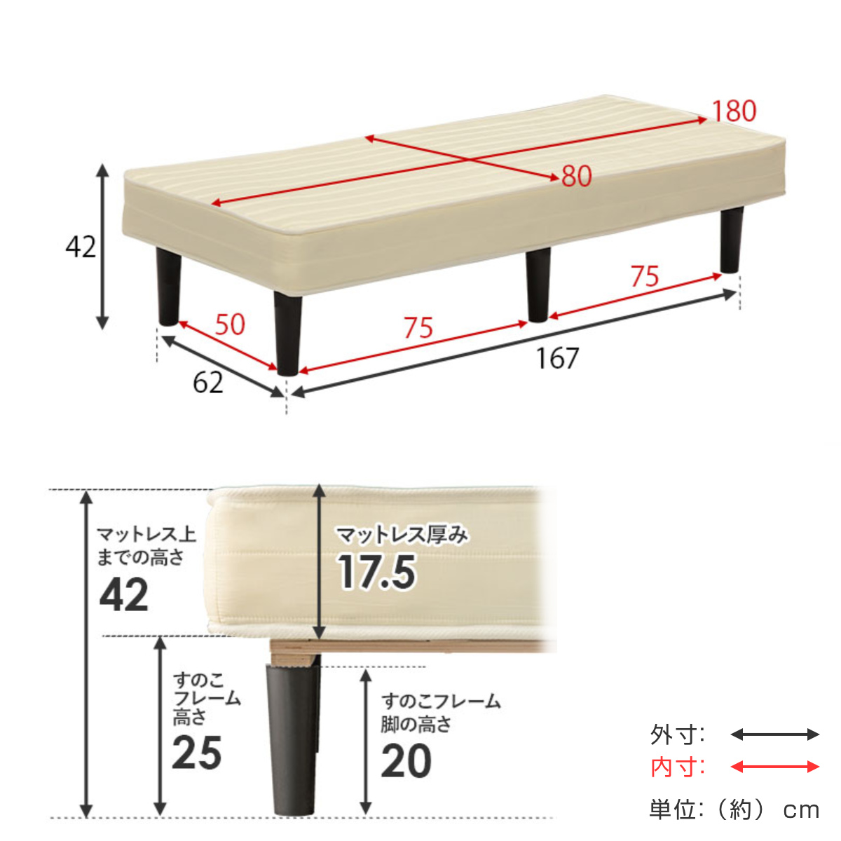 | サイズ | 約 幅80×奥行180×高さ42(cm) マットレス:約 幅80×奥行180×高さ17.5(cm) |