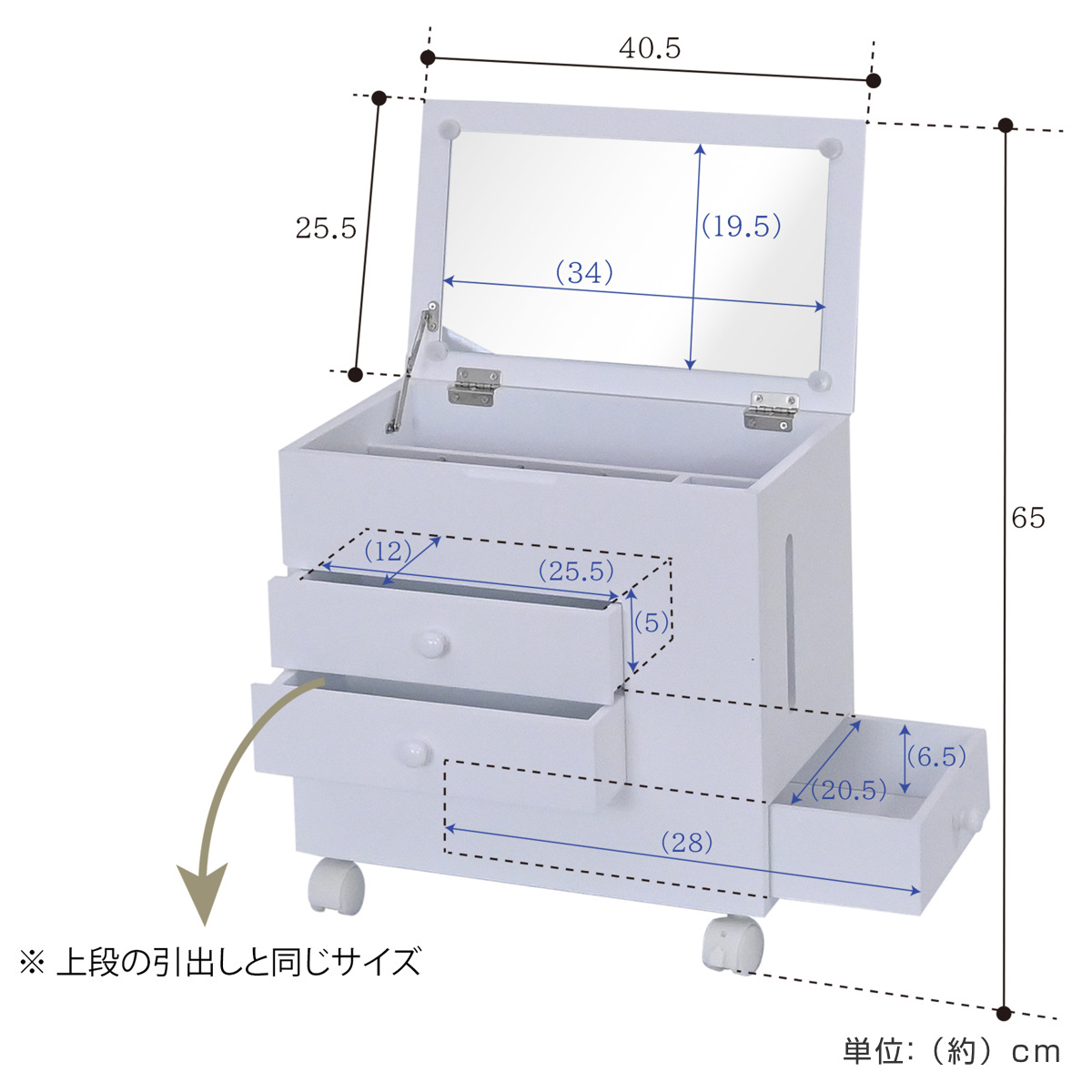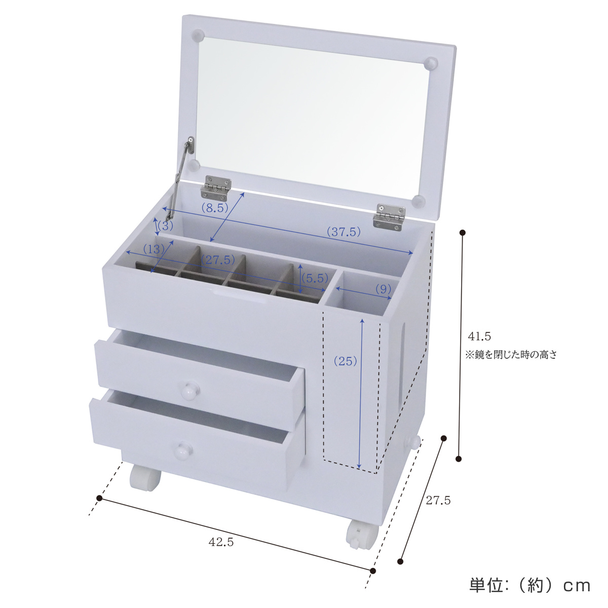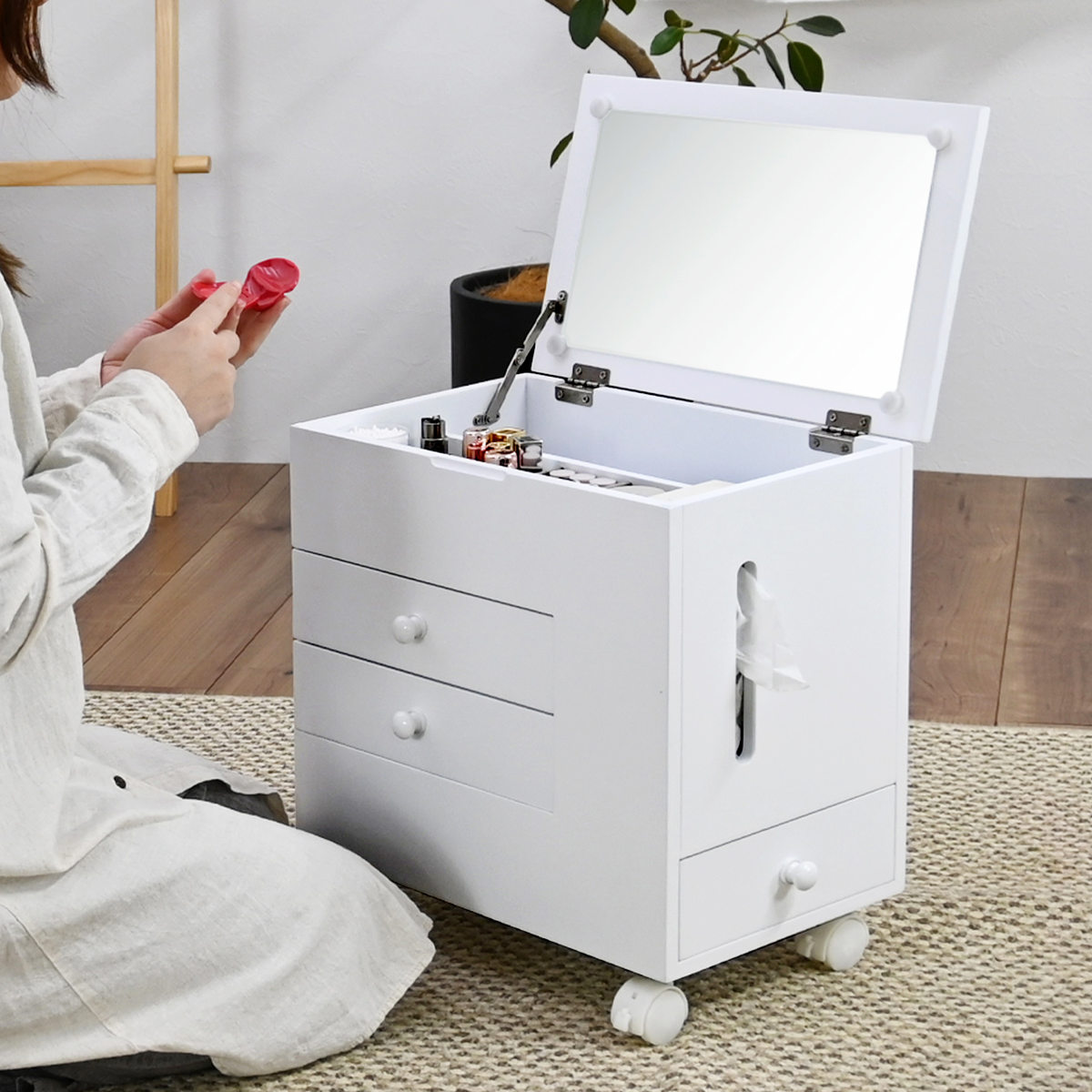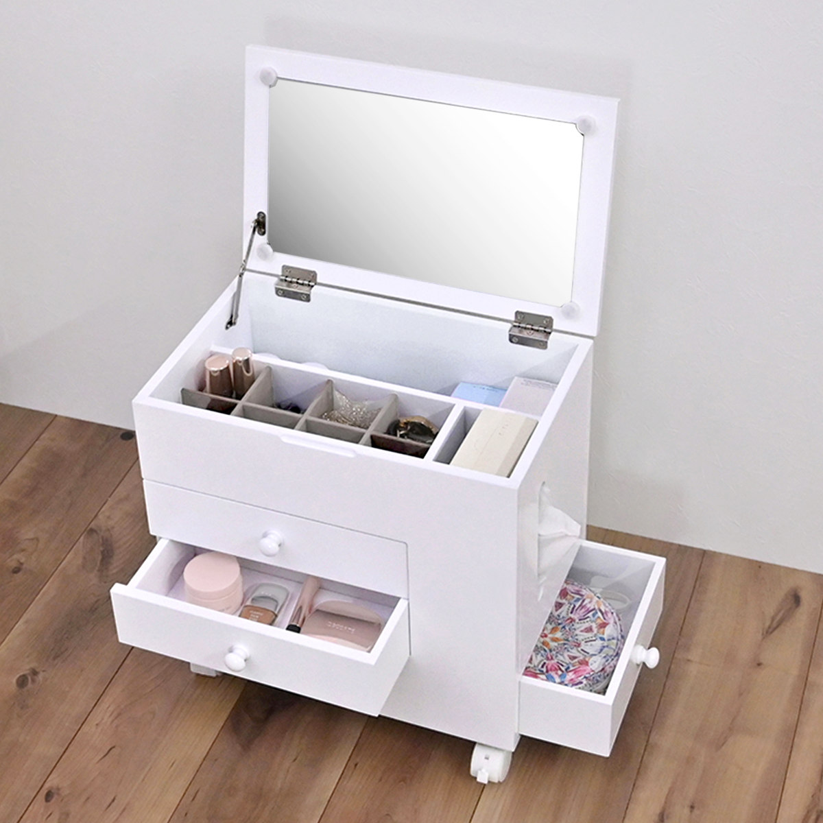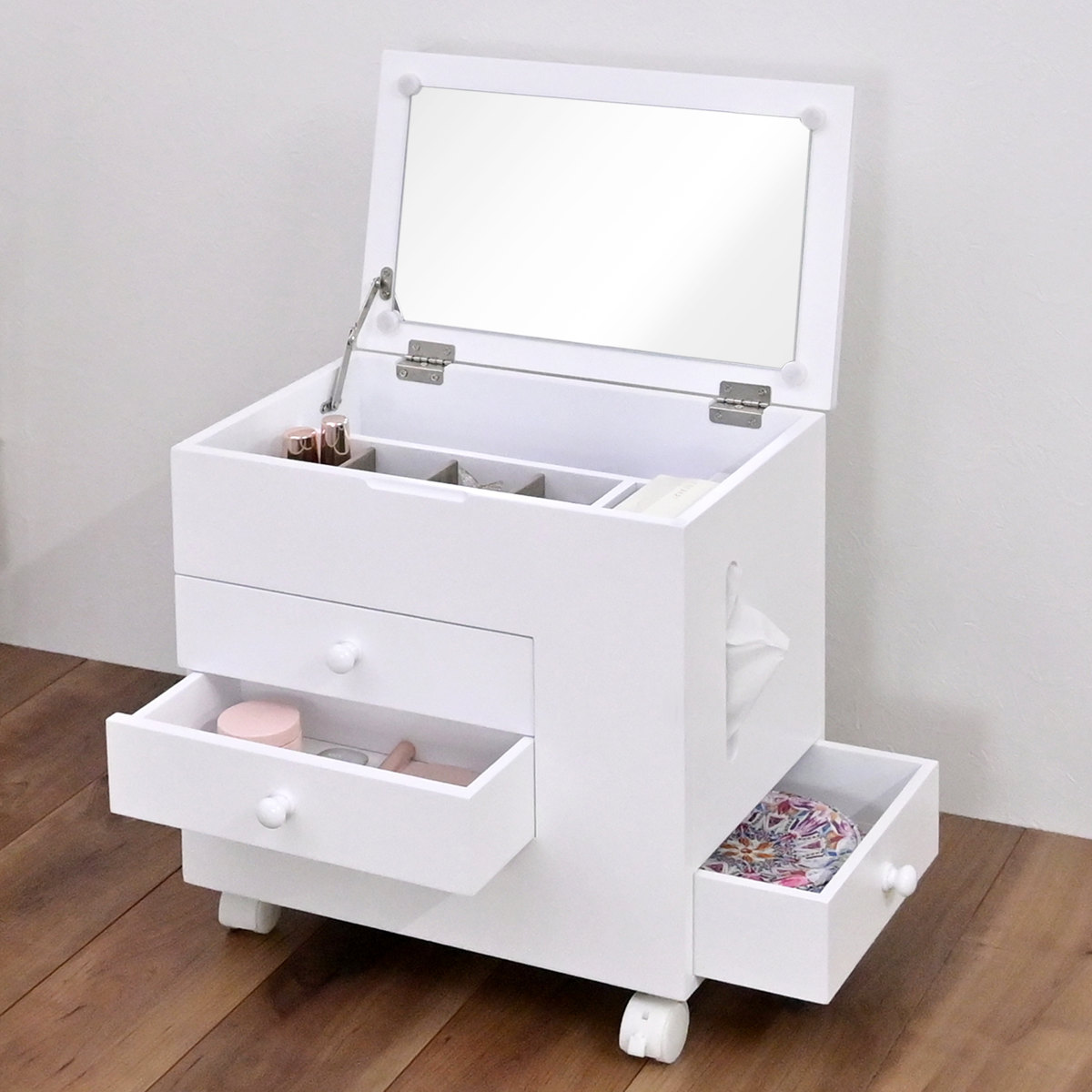 省スペース ホワイト シンプル コスメ収納 コンパクト 引き出し 収納 家具 ティッシュ入れ 小物入れ 幅45 幅30 奥行30 奥行45 高さ40 cm センチ メイク道具 ヘアメイク 身支度 ワンルーム カガミ おしゃれ お洒落 オシャレ かわいい 可愛い カワイイ 便利 移動できる 動かせる 白 1人暮らし LH21137