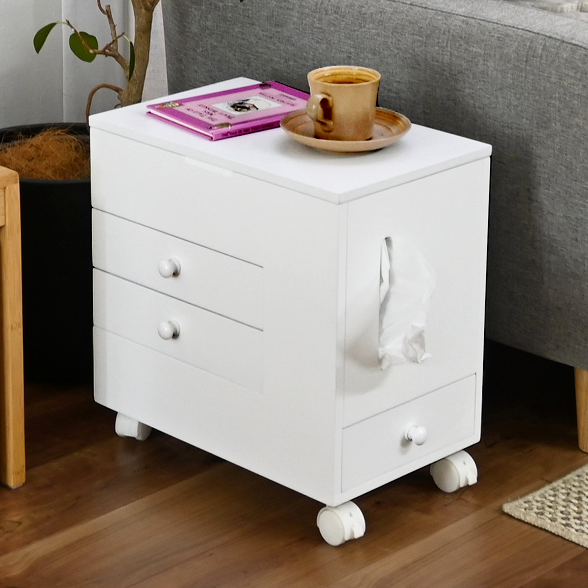 ティッシュケースを収納できるスペースを備えています。横からすっと取り出せる設計で、使いたいときにサッと使えて便利です。