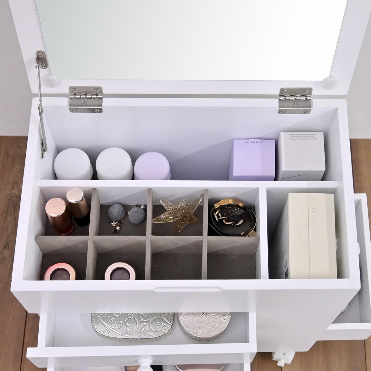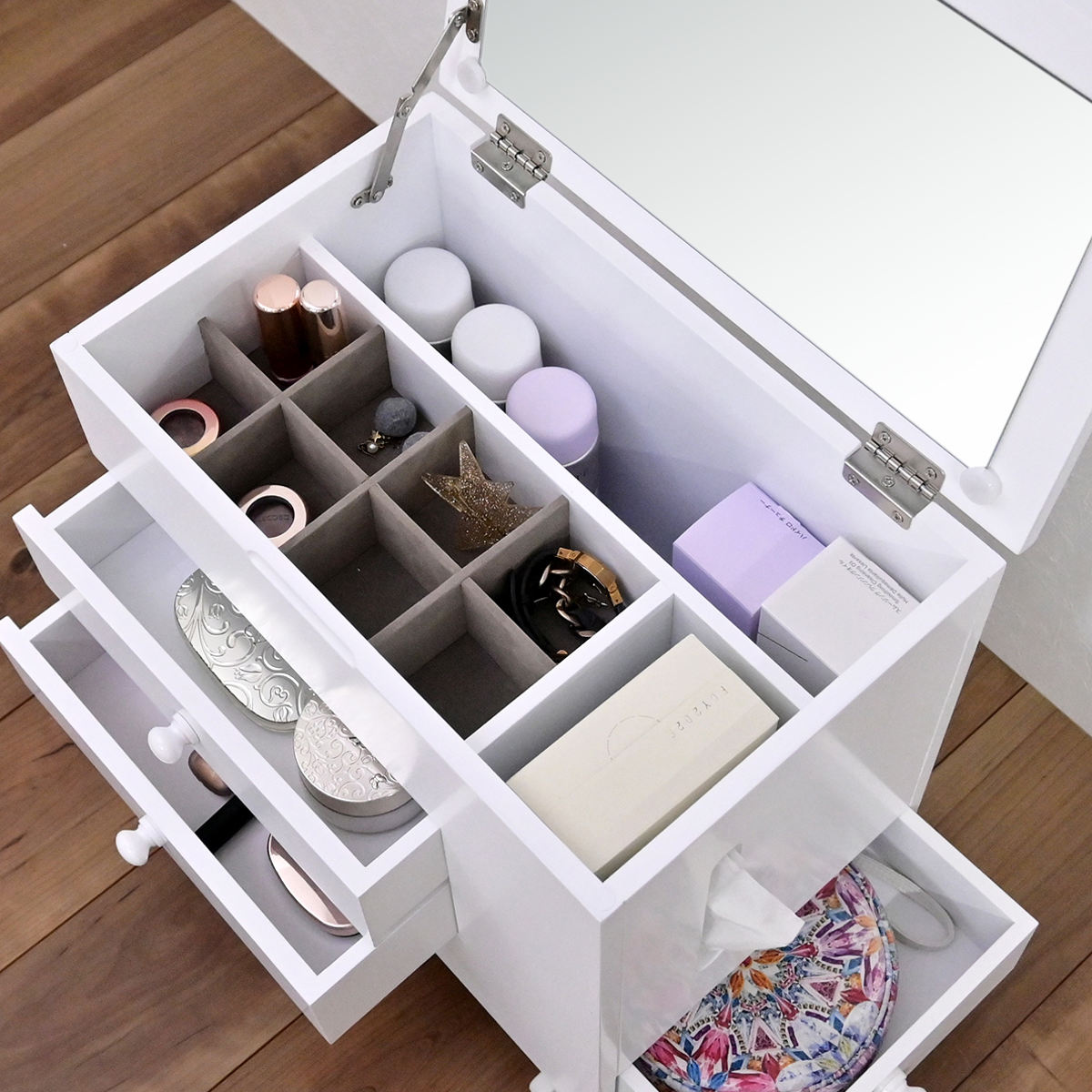 ●仕切り付きの収納スペースで、小物やアクセサリーを整理しやすくなっています。