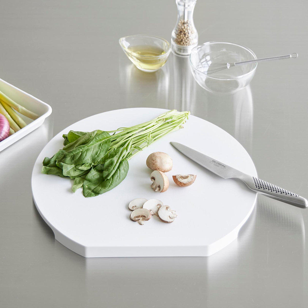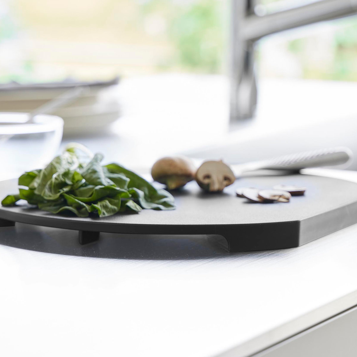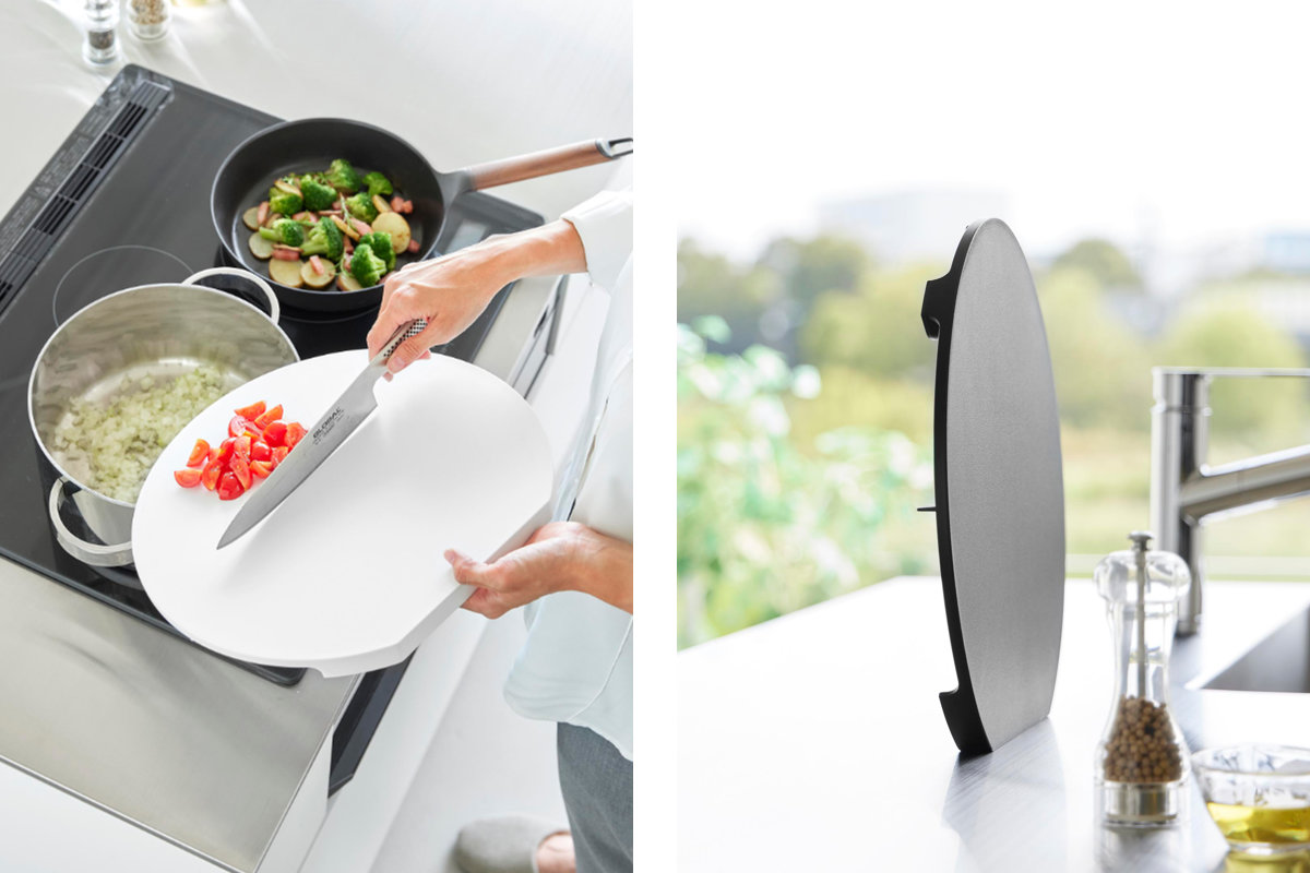 刻んだ食材をのせたままでも、まな板を広く使ってさまざまな食材を一度にカットができます。奥行を活かして食材を置いておけるので、狭い調理スペースでも使いやすいデザインです。