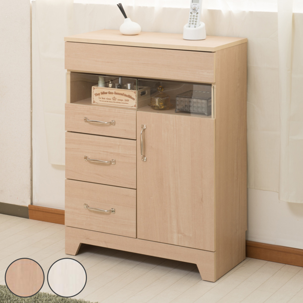リビング収納 収納ボックス 収納ケース 引出し 引出 引き出し 棚 ラック コンパクト ガラス窓 ディスプレイ カントリーテイスト カントリー 北欧 おしゃれ お洒落 シンプル 木目 木製 ナチュラル ホワイト 白 ベージュ リビング 玄関 寝室 ルーター FAX ファックス DVD CD LH8925