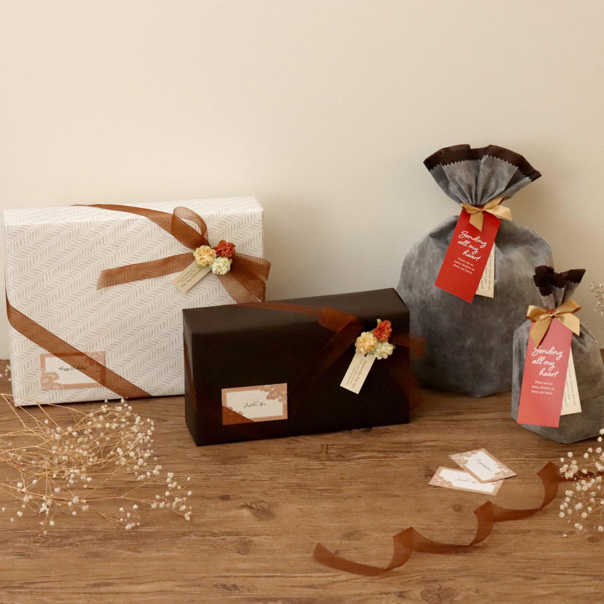 ・リボン、ギフトタグ、造花を付けてお包みします。