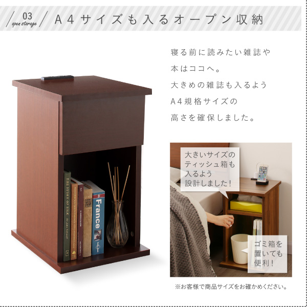 (検索キーワード) ソファサイド 収納 置台 シンプル 北欧 モダン シャビー ホワイト ブラック ナチュラル ブラウン サイドテーブル 20幅 2口コンセント 収納付き 本 雑誌 眼鏡 スマホ 収納 ベッド横 ソファ横 置き台 キャビネット チェスト白 黒 茶 古材風
