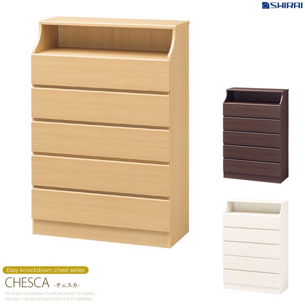 女性でも安心の、かんたん組み立て式木製チェスト"チェスカ"。新技術の採用で作業工程が短縮され、従来の組み立て時間の約半分で作ることができます。小物の整理に便利なオープン部と、取手のないスタイリッシュなデザインがモダンな印象。溢れる木質感が北欧テイストにもぴったりです。置きたい場所にぴったり選べる豊富なサイズバリエーションも魅力です。
