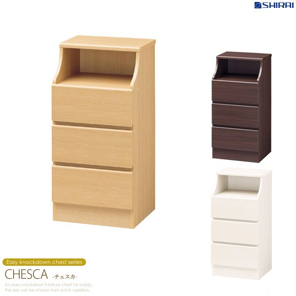 女性でも安心の、かんたん組み立て式木製チェスト"チェスカ"。新技術の採用で作業工程が短縮され、従来の組み立て時間の約半分で作ることができます。小物の整理に便利なオープン部と、取手のないスタイリッシュなデザインがモダンな印象。溢れる木質感が北欧テイストにもぴったりです。置きたい場所にぴったり選べる豊富なサイズバリエーションも魅力です。
