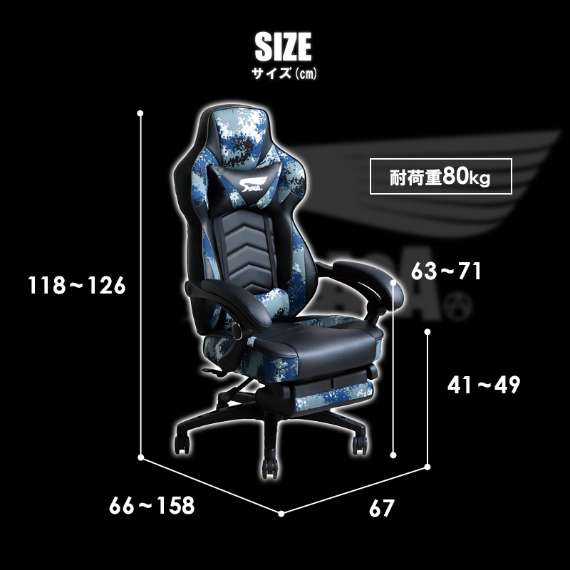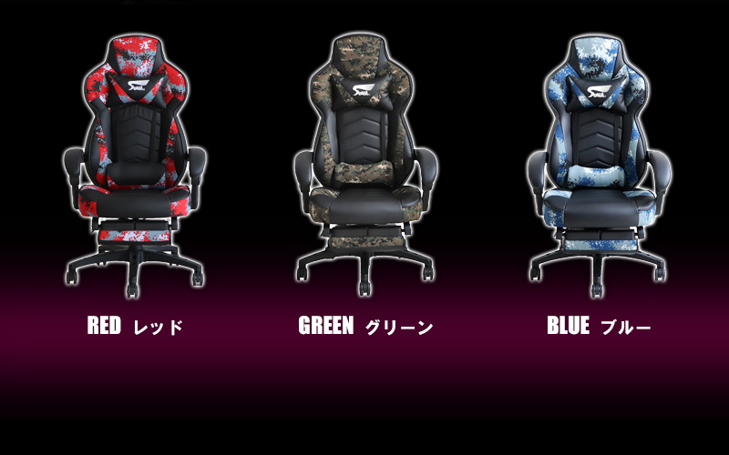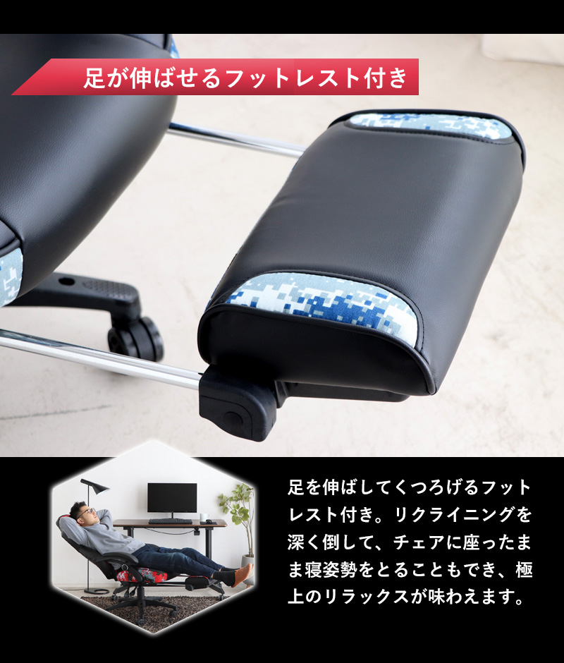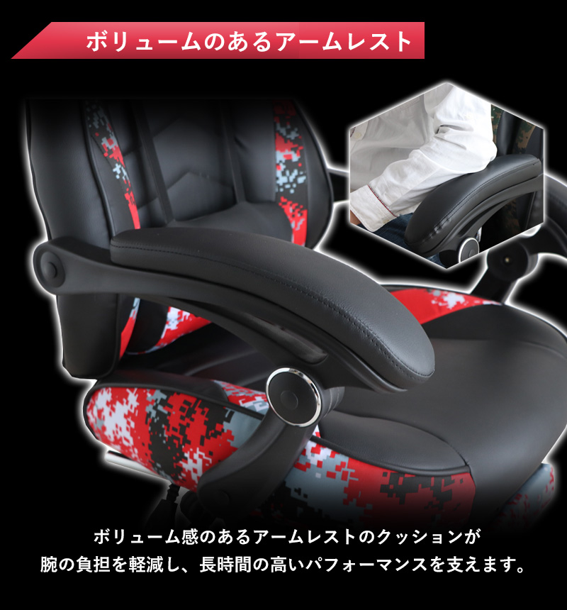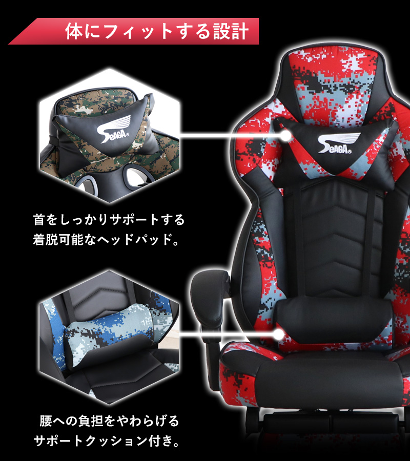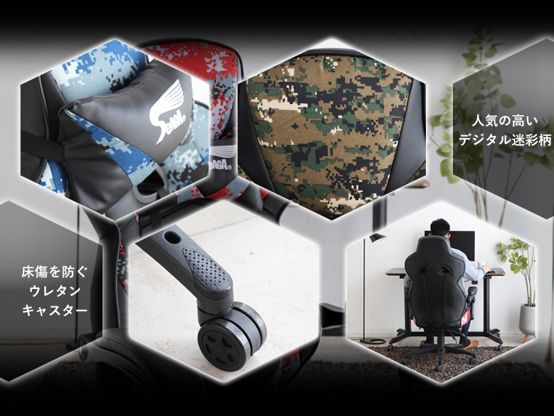 サバイバルゲームを意識したデジタル迷彩柄がお洒落なゲーミングチェア。体を包み込むようなバケットシートに、頭と腰をサポートする2つのクション付き。長時間のプレイも疲れにくいレタンフォームの極厚座面仕様で、快適な座り心地を実現します。ゲーミングチェア目的以外にも、テレワークやパソコン作業、書斎用デスクの椅子としても快適。オフィスチェアとして仕事場でも活躍します。