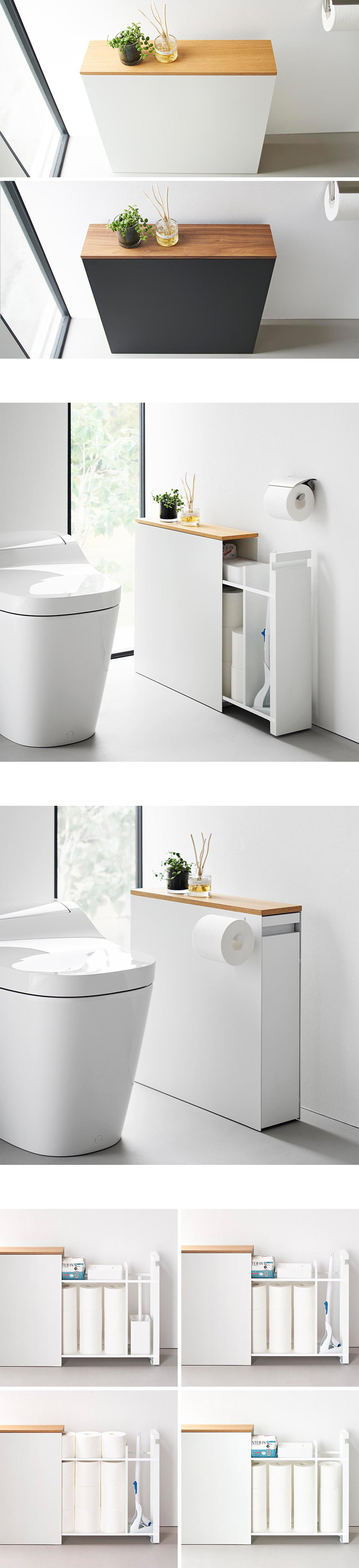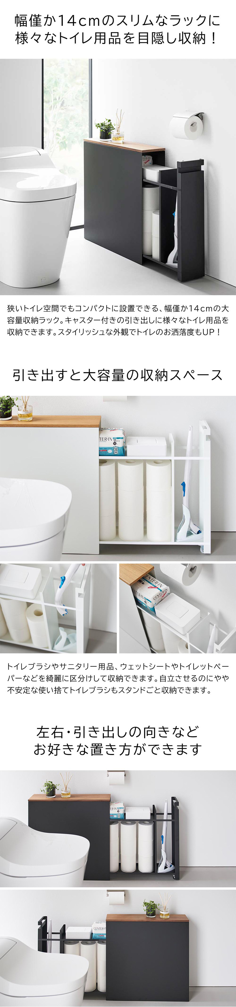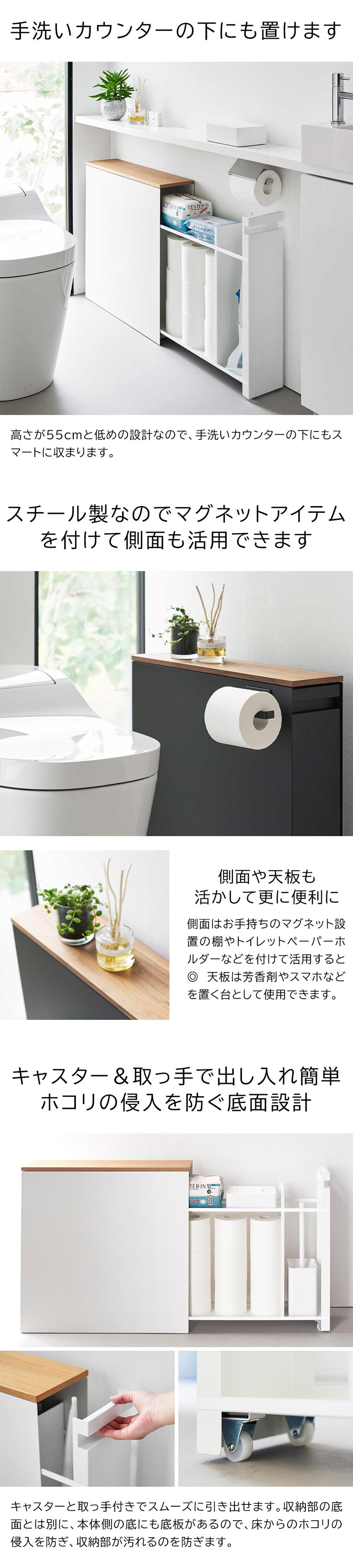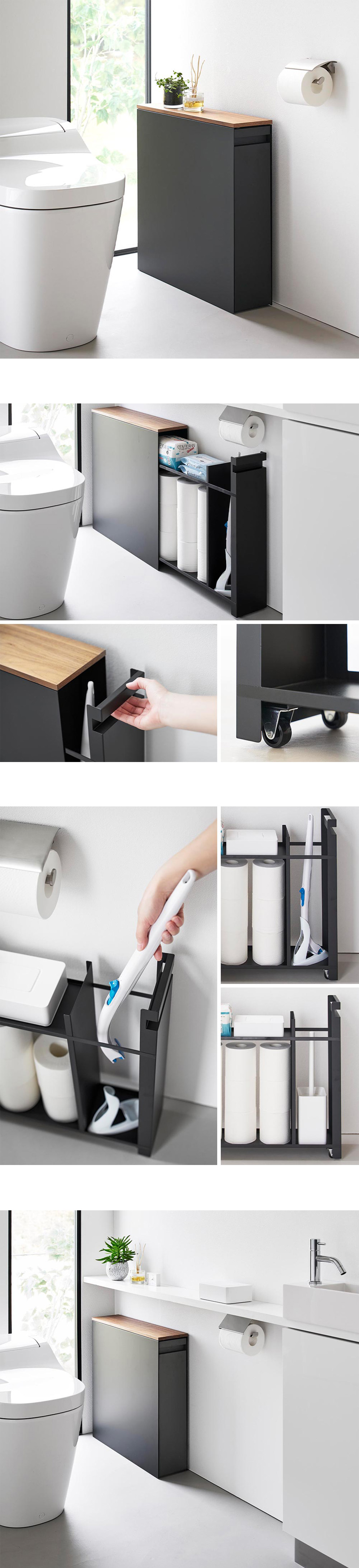 ![]() トイレ用品を省スペースに 隠しながら沢山収納できる スタイリッシュな収納ラック トイレの狭い空間でも、様々なトイレ用品の一括収納ができるスリムな引き出し式ラックです。幅僅か14cmの細長いラックで、トイレブラシやサニタリー用品、トイレットペーパーなどを綺麗に区分けして収納できます。トイレブラシ収納部は使い捨てトイレブラシにも対応。キャスター付きの引き出しで、使わない時は全ての小物を隠せ、スッキリとしたトイレ空間になります。高さが55cmと低めに設計されているので、手洗いカウンターの下にも収まります。天板は天然木でできており、シンプルでスタイリッシュ!芳香剤やインテリア、スマホなどを一時置きする台としても使え、大変便利です。スチール製なので、側面にお手持ちのマグネット収納アイテムなどを取り付けて、更に収納の幅を広げるのも◎本体の底面には底板があり、ホコリなどが下から引き出しの中に侵入するのを防ぎます。 ![]() ![]() ![]() ![]() ![]() ![]() ![]() |
