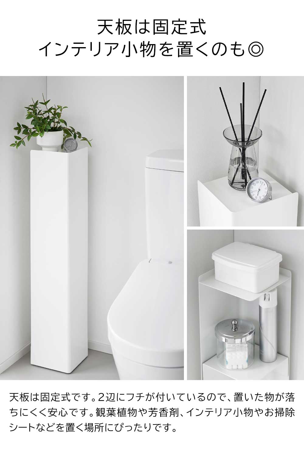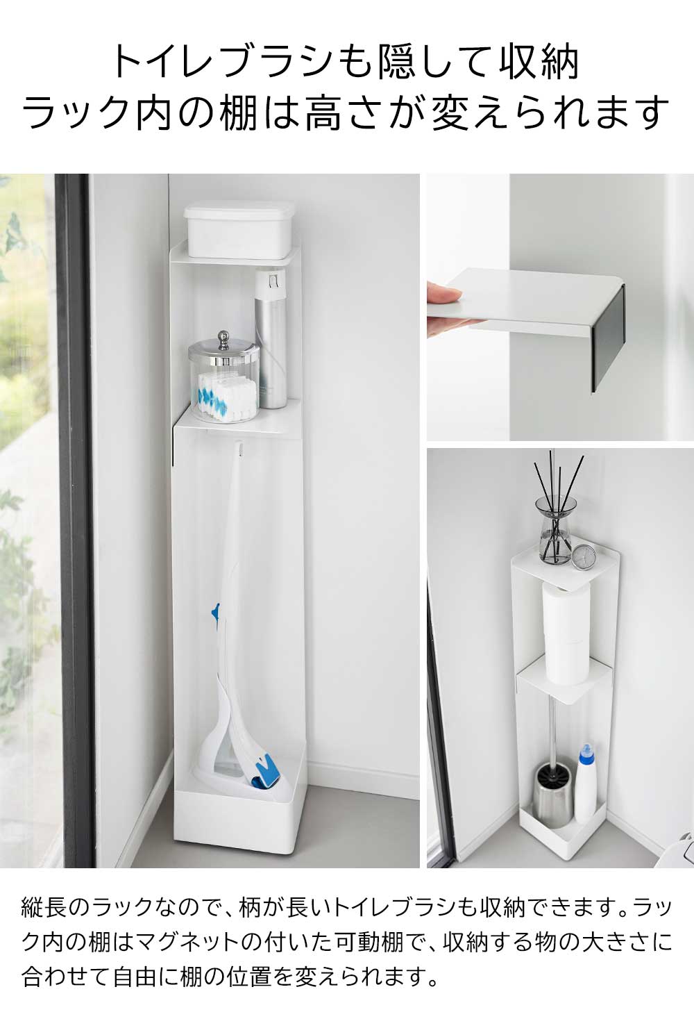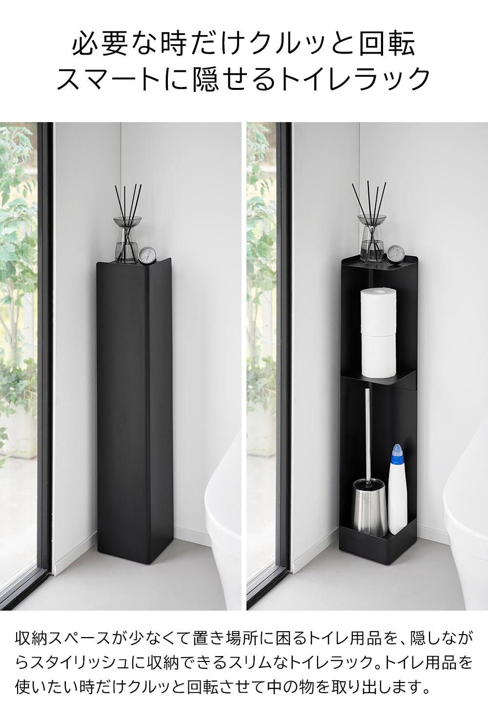 ![]() トイレ用品を隠して収納! クルッと回転して取り出す スリムなトイレラック トイレ用品を隠しながら収納できる、とてもスリムなトイレラックです。限られた空間の中でも邪魔にならずにスマートに設置でき、シンプルな外観で生活感を一掃します。トイレ用品を使いたい時だけクルッと回して中の物を取り出します。縦長のラックなので長いトイレブラシも収納できます。ラック内の棚は位置を自由に変えられるマグネットタイプ。トイレットペーパーや消臭スプレー、サニタリー用品など、収納したい物の大きさに合わせて棚の高さを決められます。ラックの下には滑らかに動くキャスターが付いているので、掃除の際の移動もラクラク。外からキャスターが見えないデザインで、スタイリッシュに空間に馴染みます。 ![]() ![]() ![]() ![]() ![]() ![]() ![]() ![]() ![]() ![]() |
