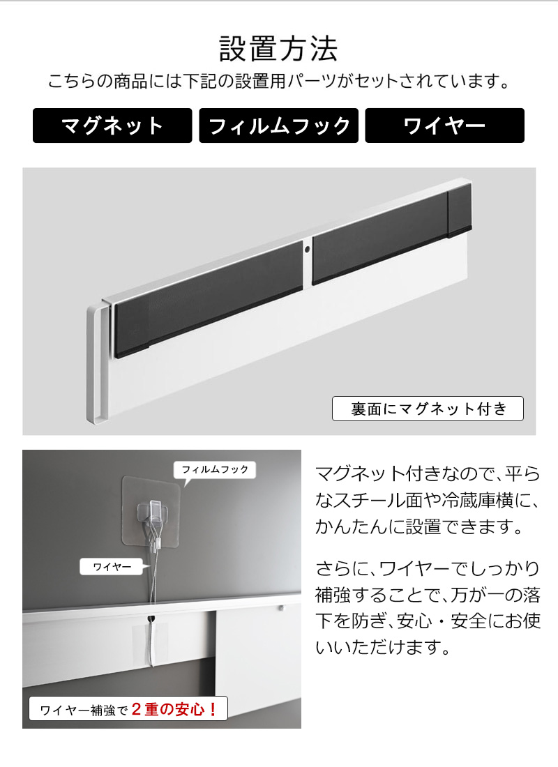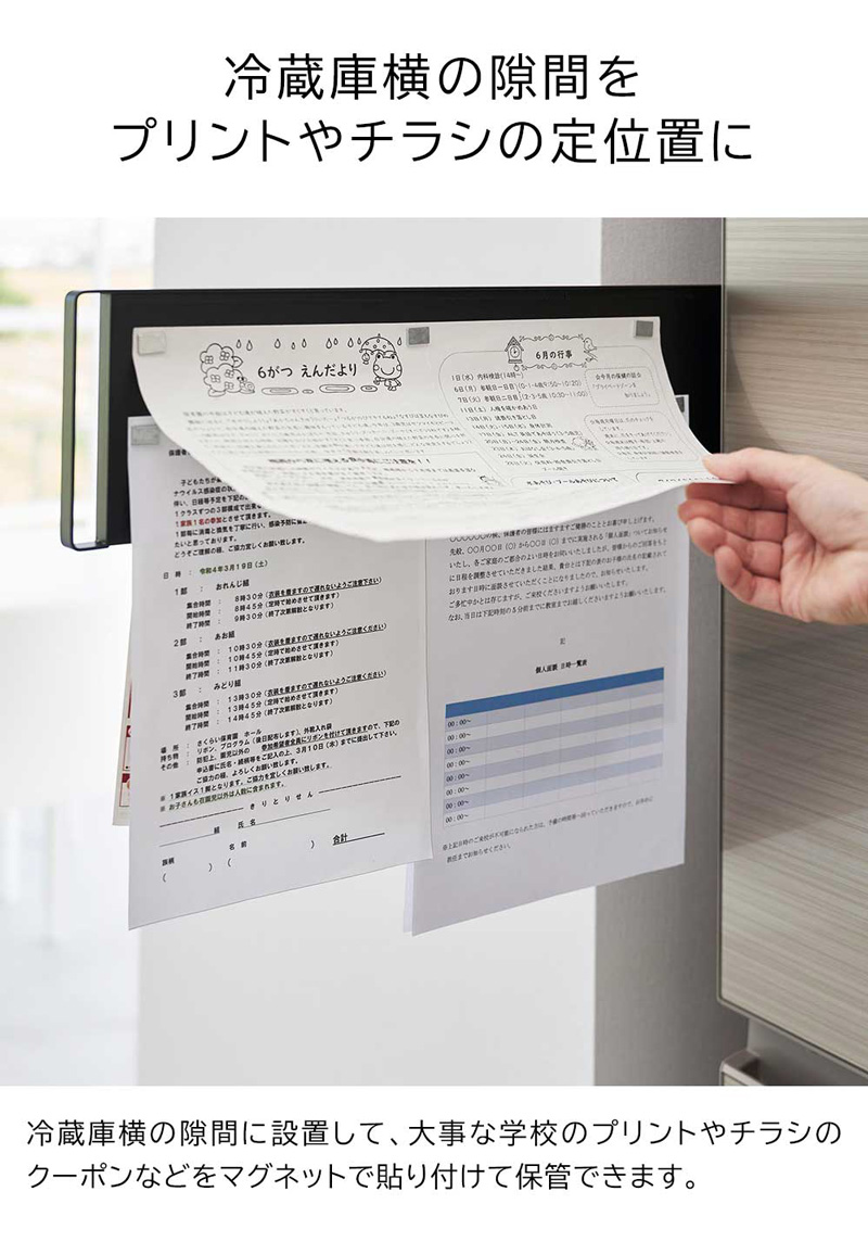 ![]() 見たい時だけ引き出せる! 大事な学校のプリントやクーポンなどを失くさないよう冷蔵庫に貼っている方も多いと思いますが、ごちゃごちゃして生活感が出るのが困りどころ。そんなプリント類の掲示に便利なのがこちらのパネル。冷蔵庫横の隙間にマグネットで取り付けられ、必要な時だけ引き出すことができます。普段は隠しておけるので見た目がすっきり!パネルはワイドサイズで両面が使え、たくさんのプリントが貼れます。冷蔵庫の左右どちらにでも取り付けが可能です。大事なプリントを冷蔵庫横の 隙間に隠してすっきり保存 ![]() ![]() ![]() ![]() ![]() ![]() ![]() ![]() ![]() |