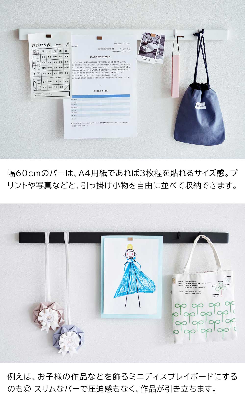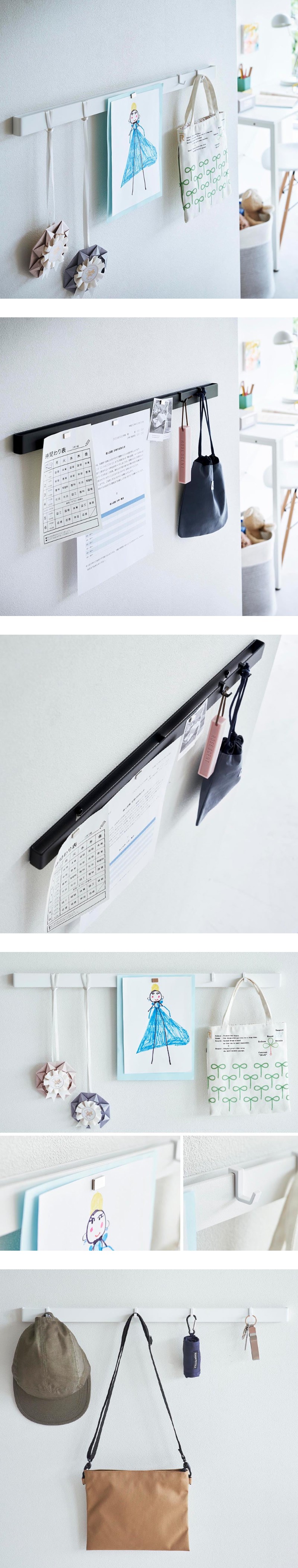 ![]() 我が家の便利なミニ掲示板! マグネットであれこれ貼って 収納できるスチールバー 地域の回覧書類やお子様の持ち帰ってきた時間割・プリントなど、見たい時にすぐに確認できる場所に貼っていると便利な物は沢山あります。こちらの商品は、壁の穴が目立たない石こうボードピンで簡単に取り付けられる、幅60cmのスチール製のバーです。木ネジでの取り付けも可能です。スチールバーにお手持ちのマグネットでお好きな物を貼り付けて収納します。作品や写真などを貼り、ディスプレイボードのように使うのも◎ また、フックが付属しているので、お好みの位置に取り付け、鍵や手提げバッグなど、普段使いの小物を引っ掛けて収納すると更に便利になります。子供部屋やリビング、廊下や玄関など、お部屋の様々な場所で大活躍する収納ツールです。 マグネットは付属いたしません。 ![]() ![]() ![]() ![]() ![]() ![]() ![]() ![]()