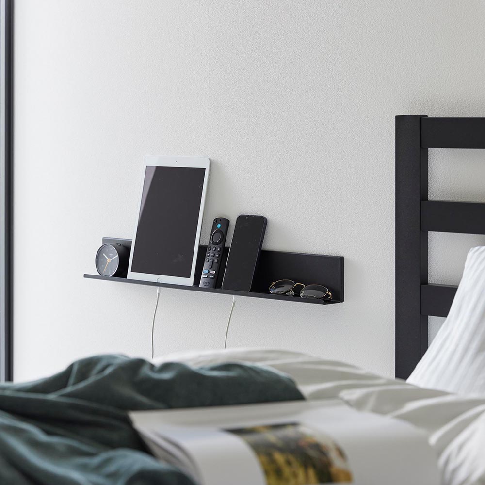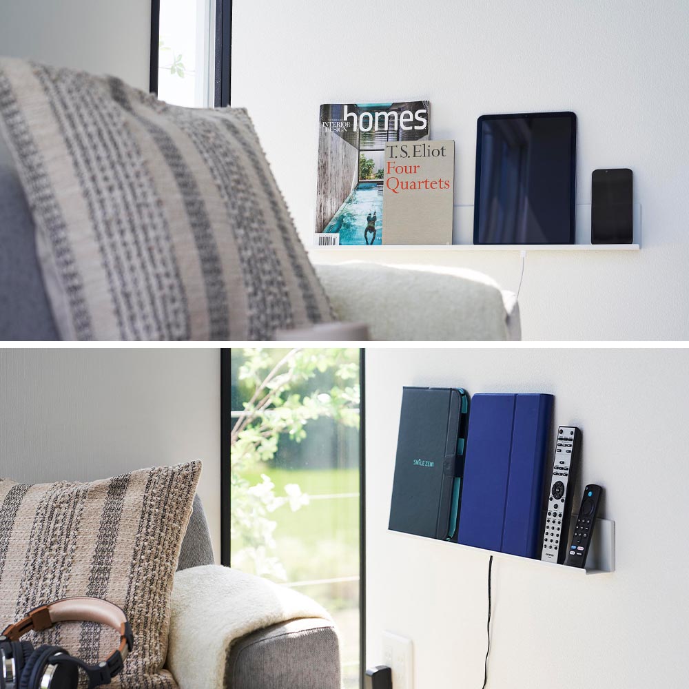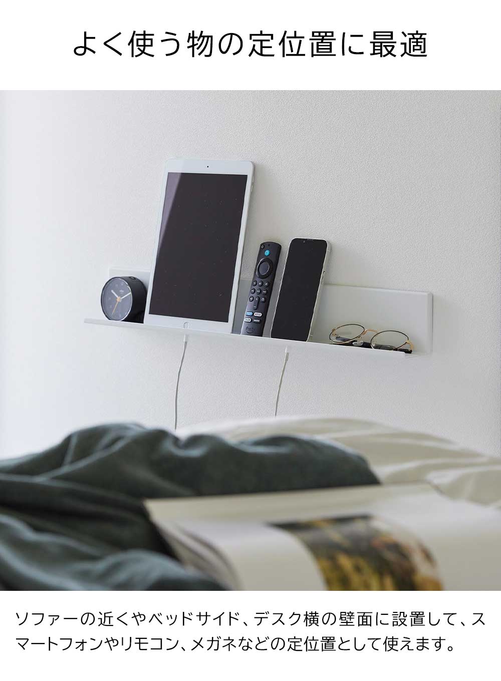 ![]() タブレットPCや本を 浮かせて収納できる スリムな壁掛け棚 場所を選ばないシンプルなデザインで、リビングや寝室に馴染む壁面収納棚です。 壁に浮かせてタブレットPCや本が収納できるので、スペースの有効活用ができます。棚にはケーブルを通せる穴があり、充電ケーブルを挿したままタブレットPCやスマートフォンの収納が可能。 また、充電をしない時には充電ケーブルの先端を引っ掛けておけて便利です。 お部屋の中で迷子になりがちなリモコンやメガネなどの定位置として使ったり、お気に入りの本や時計などを置いてディスプレイ収納ができるスリムなウォールシェルフです。 ![]() ![]() ![]() ![]() ![]() ![]() ![]() ![]() ![]() ![]() ![]() ![]()