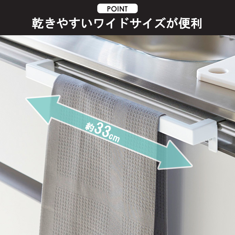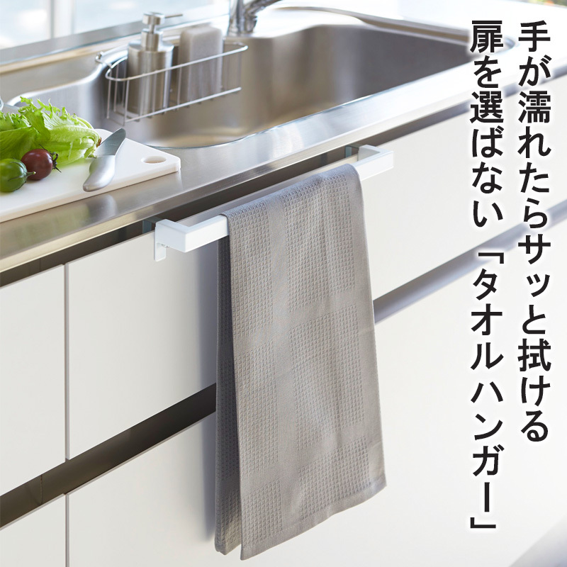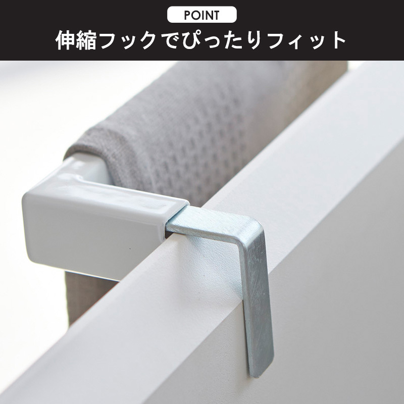 キッチンのシンク扉や洗面の下の扉にフックを引っ掛けて使える「キッチンタオルハンガーバー ワイド」