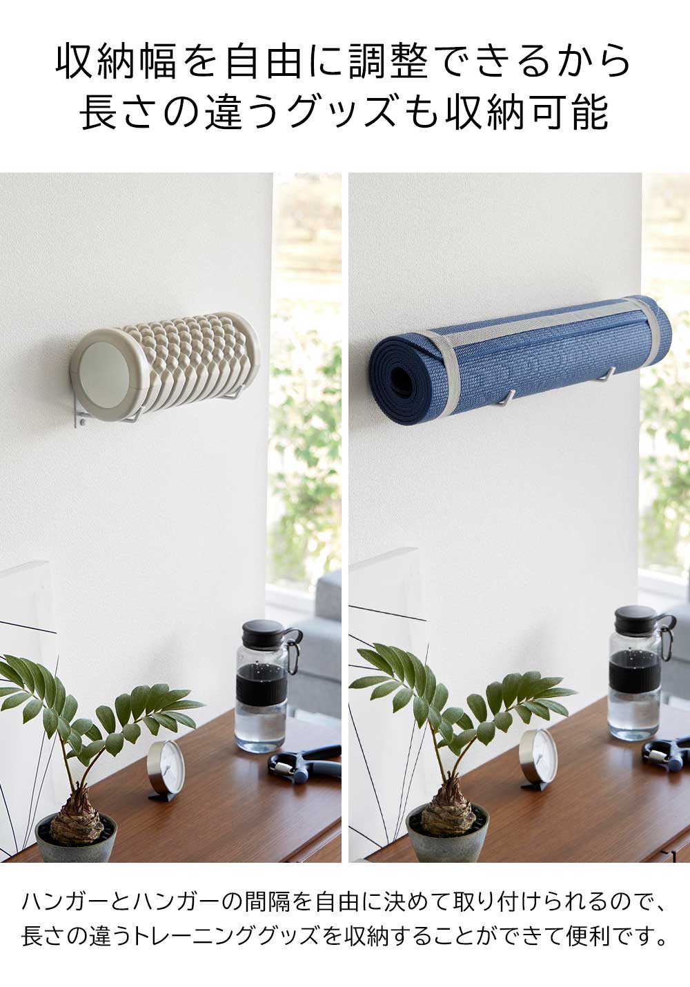 ![]() ヨガマットやグッズを壁面へ 浮かせてスッキリ収納できる ヨガマットハンガー 自宅でトレーニングの「宅トレ」派の人も、ジムに通ってトレーニングの「ジムトレ」派の人も、ヨガやトレーニングマットの置き場所に困っていませんか? そんな時は、壁面に浮かせて収納できるハンガーが便利です。石こうボード壁対応のピンで壁に取り付けるだけで設置完了。 壁の穴も目立ちにくい仕様です。ハンガーとハンガーの間の幅は自由に決められるので、サイズの違うマットやトレーニンググッズの収納も可能。 トレーニング中は、ドリンクやタオルなどの一時置きに◎ 複数使いで、自分と家族の分を分けて収納する事も出来て便利です。 ![]() ![]() ![]() ![]() ![]() ![]() ![]() ![]() ![]() ![]() ![]() |