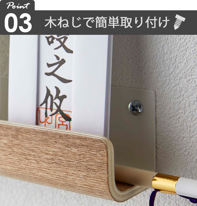 神棚が置けないご家庭には、限られた場所でも設置が可能な壁掛けタイプの神札ホルダーが便利。どなたでも木ネジで簡単に取り付け可能です。