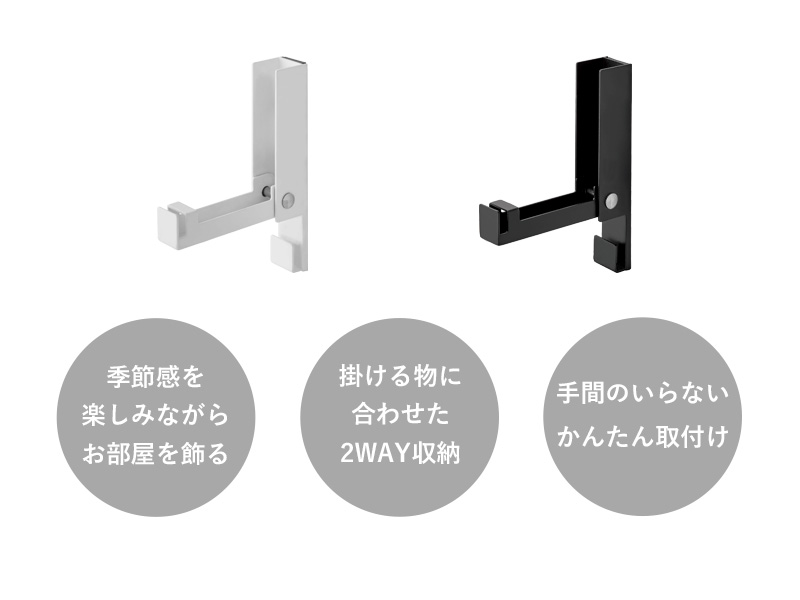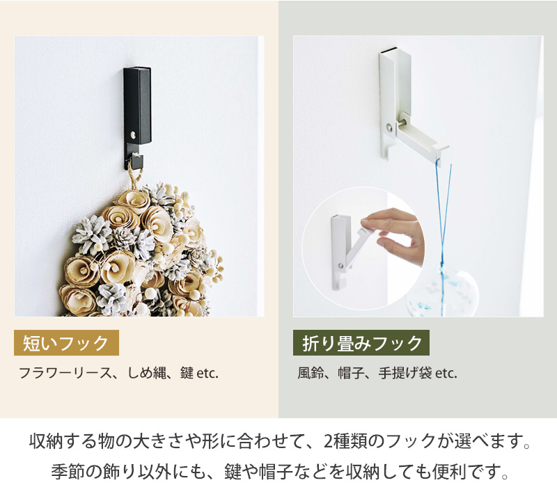 風鈴やしめ縄、クリスマスリースなど、季節ものの飾り付けに便利なフック型ホルダーです。季節の移り変わりを楽しめる、豊かな暮らしをお届けします。