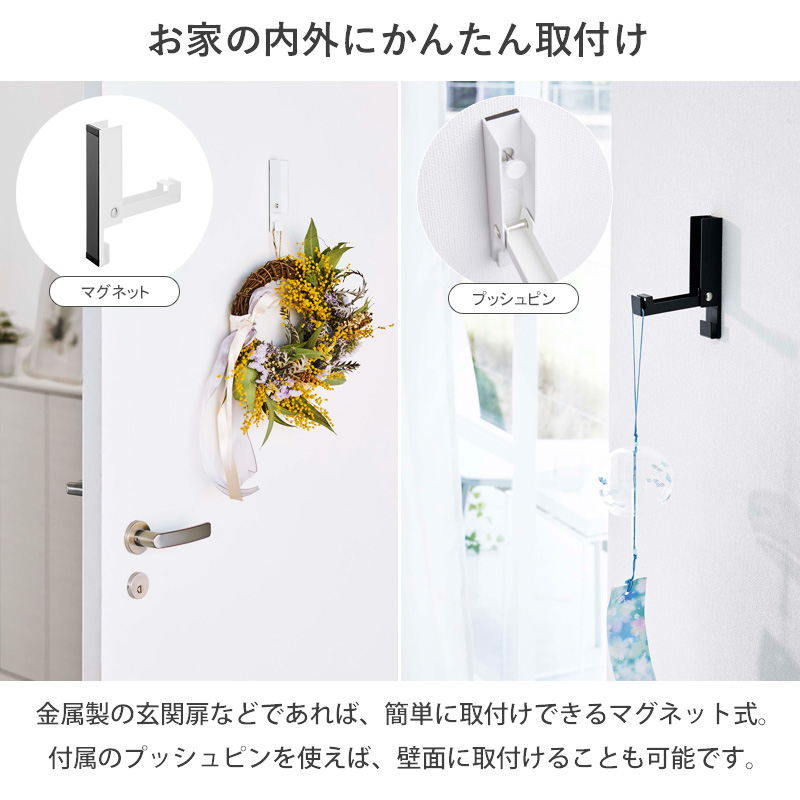風鈴やしめ縄、クリスマスリースなど、季節のものの飾り付けに便利なフック型ホルダーです。 マグネットか付属のプッシュピンを使うことで、玄関扉や屋内の石こう壁などに簡単に取付けできます。 季節の移り変わりを楽しめる豊かな暮らしをお届けします。