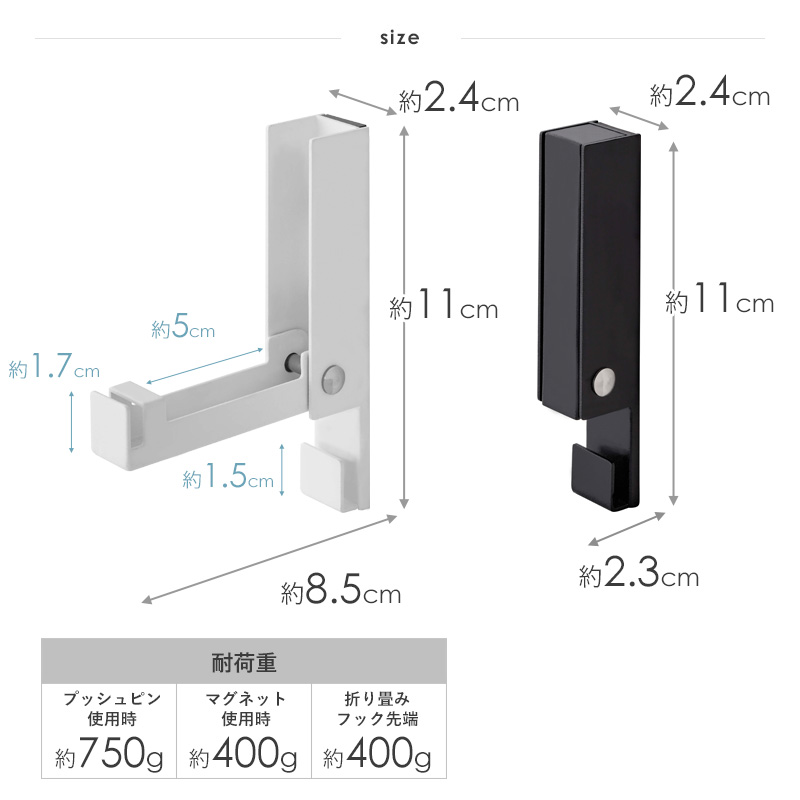 折り畳みフック使用時:約幅2.4×奥行8.5×高さ11cm