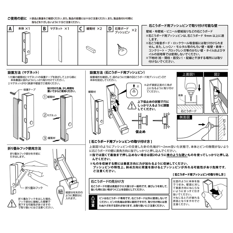 仕様 付属品:マグネット×1、緩衝材(シリコーン)×2、石こうボード用プッシュピン×2