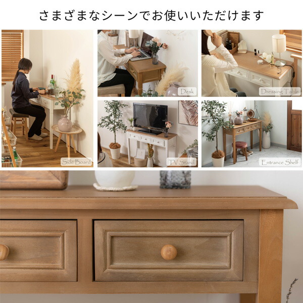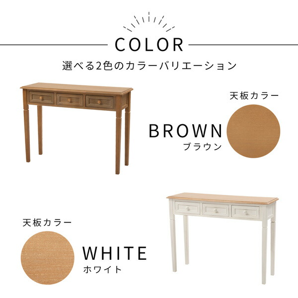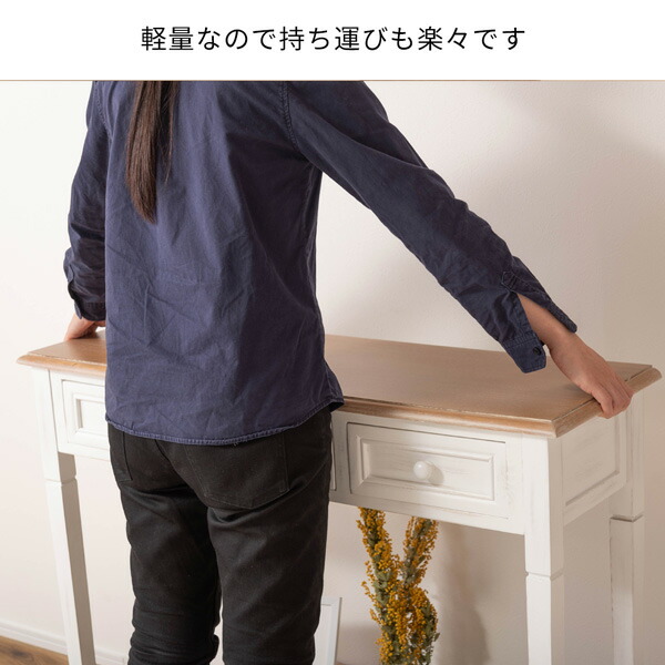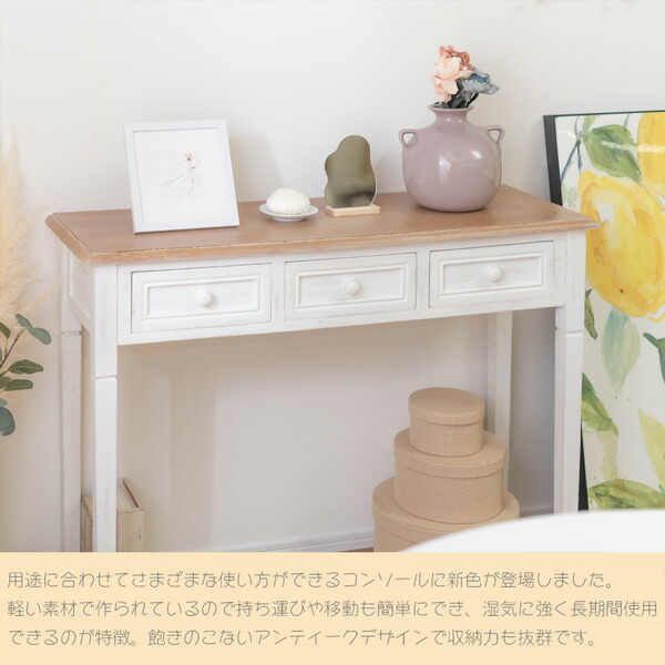 優雅なアンティーク調のデザインが特徴の「東谷 COD-456」。コンパクトなサイズながら、3つの引き出し付きで収納力も抜群です。ホワイト×ナチュラルウッドのカラーリングが空間に温かみを加え、玄関やリビング、寝室などさまざまな場所で活躍します。