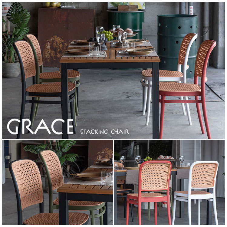 | 商品説明 背面と座面にラタン調のデザインを施した、トレンド感溢れるグレイスチェア。ポリプロピレン製なので軽量で耐久性があり、傷や汚れに強いのも嬉しいポイント。どのカラーも落ち着いた合わせやすい色味をチョイスしており、お部屋ではもちろん、ガーデンシーンにもよく馴染むデザインです。スタッキング可能なので場所を取らずに収納することが出来ます。 | ||||||||