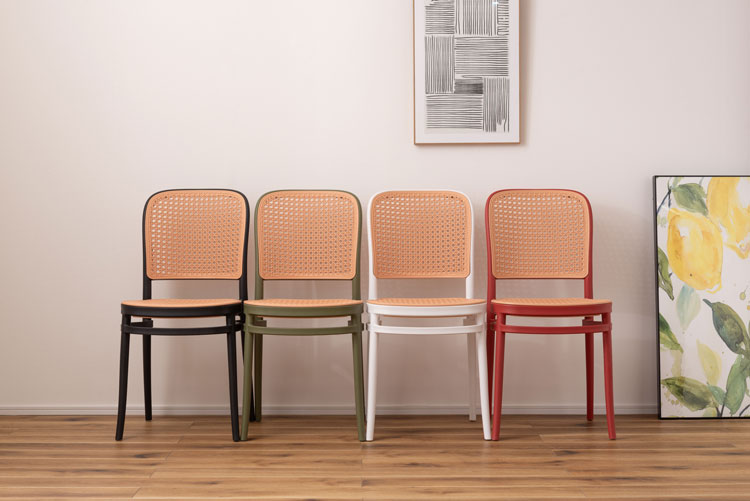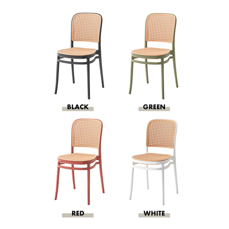 トレンド感あふれる【東谷 TOE-129】ラタン調スタッキングチェアは、インテリアに溶け込むデザイン性と機能性を兼ね備えた一脚です。ポリプロピレン製の軽量設計で、女性でも簡単に持ち運びが可能。スタッキング収納ができるため、省スペースでの管理にも最適です。ラタン調の通気性の良い座面と背もたれは、長時間座っても快適な座り心地を提供します。ブラック・グリーン・レッド・ホワイトの4色展開で、カフェやダイニング、オフィスなど幅広いシーンで活躍します。