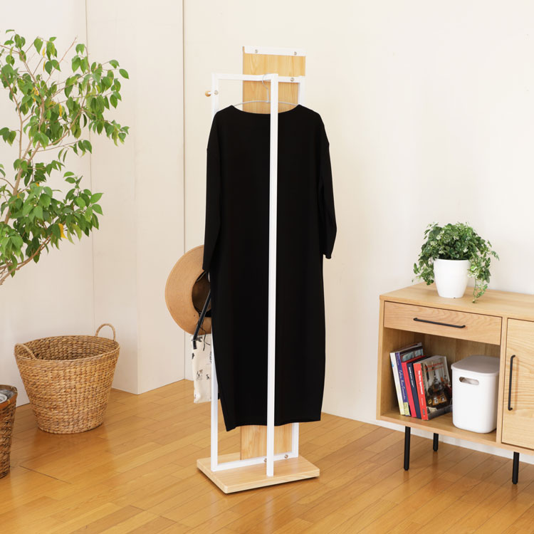 「弘益 HM-400」は、ハンガーラックと全身ミラーが一体化した便利なスタンドミラーです。玄関、リビング、寝室など、さまざまなシーンで活躍する省スペースデザインが特徴。ハンガーフックも2個付属し、帽子やバッグ、ジャケットをスマートに収納できます。