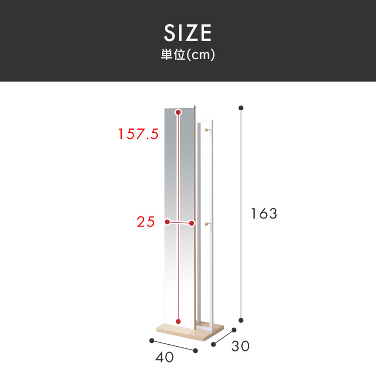 | 商品サイズ 約幅40×奥行30×高さ163cm、鏡サイズ:幅25×高さ157.5×厚み3cm | ||||||||