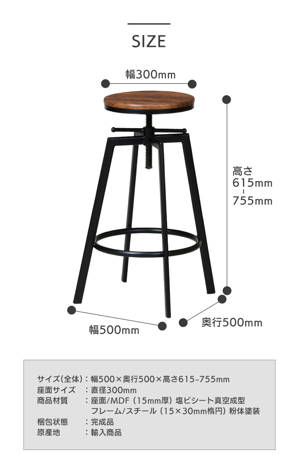 | 全体サイズ | 幅500×奥行500×高さ615?755mm 座面サイズ:Φ300mm |