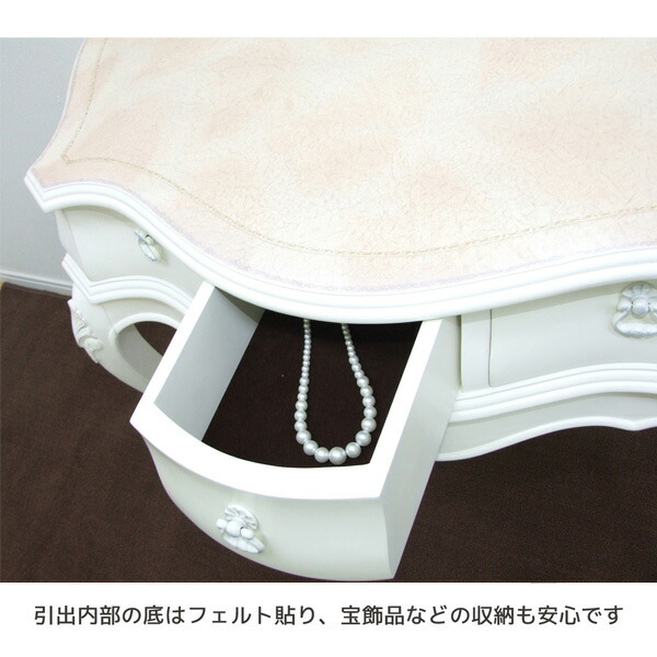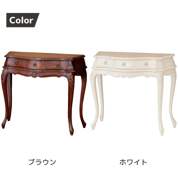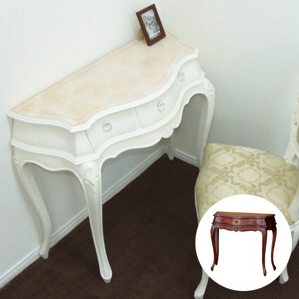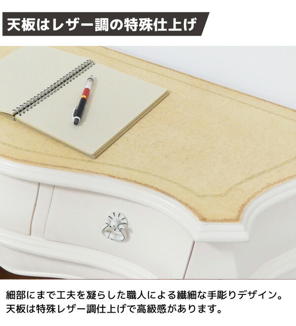 | 商品説明 天板はレザー調の特殊な仕上げになっておりますので、高級感があります。 ネコ脚、手彫り仕上げ、引出内部の底はフェルト貼りなど、細部にまで工夫を凝らしております。玄関やリビングでもお使いください。 | ||||||||
