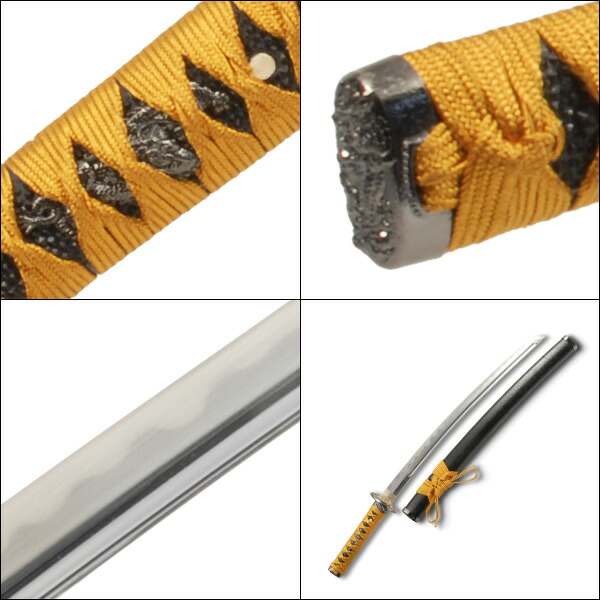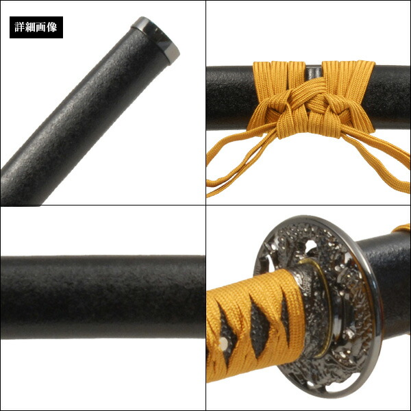 | 材質 鞘/朴の木、柄/プラ製(黒鮫)、金具/合金、下緒/人絹 金茶糸、柄糸/人絹 金茶糸 | ||||||||