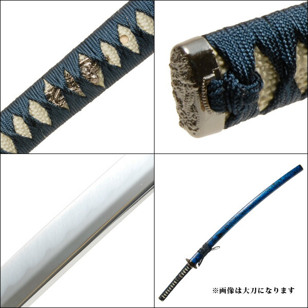 | 材質 鞘/朴の木、柄/プラ製(白鮫)、金具/合金、下緒/人絹 青糸、柄糸/人絹 青糸 | ||||||||