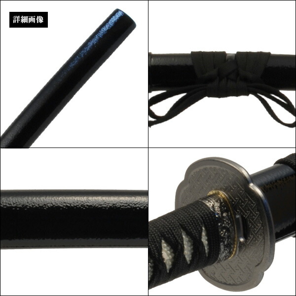 | 仕様 鎬刀身(直刃刃紋)、黒艶塗り鞘、縁・頭・目貫:龍の図、地紋木瓜鍔 | ||||||||