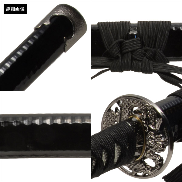 | 仕様 刀紋:国広写し刃紋(樋入り刀身)、鞘:槌目地黒塗り鞘、鍔:竜透かし鍔、緑・頭金具:黒無地緑頭、目貫:竜図目貫、鐺金具:鍬形鐺 | ||||||||