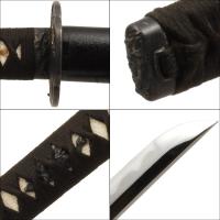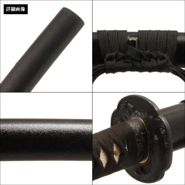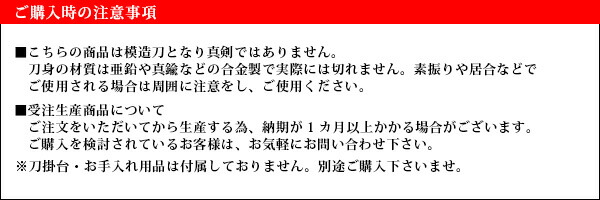 | 材質 刀身:合金、柄下地:朴木、柄糸:綿糸(黒)、鮫皮:本鮫(白)、鍔:合金製、縁頭:合金製、目貫:合金製 | ||||||||