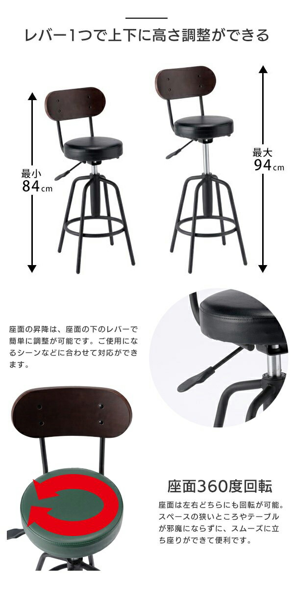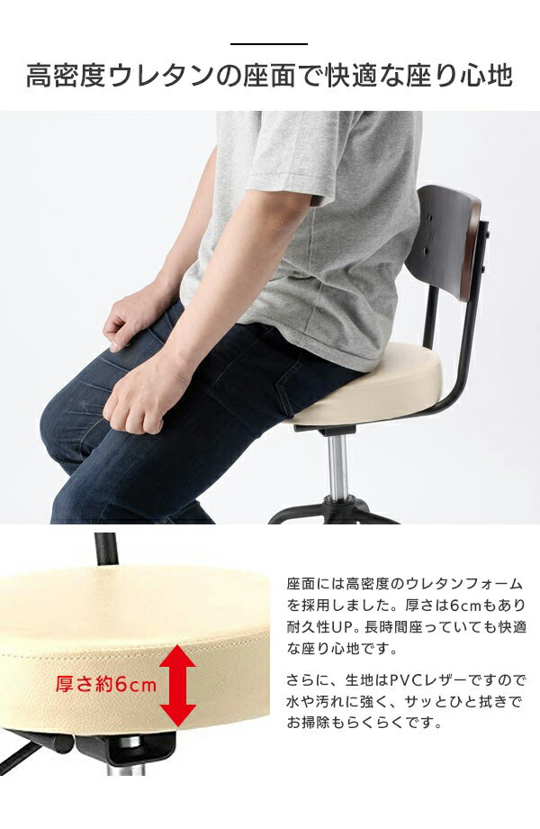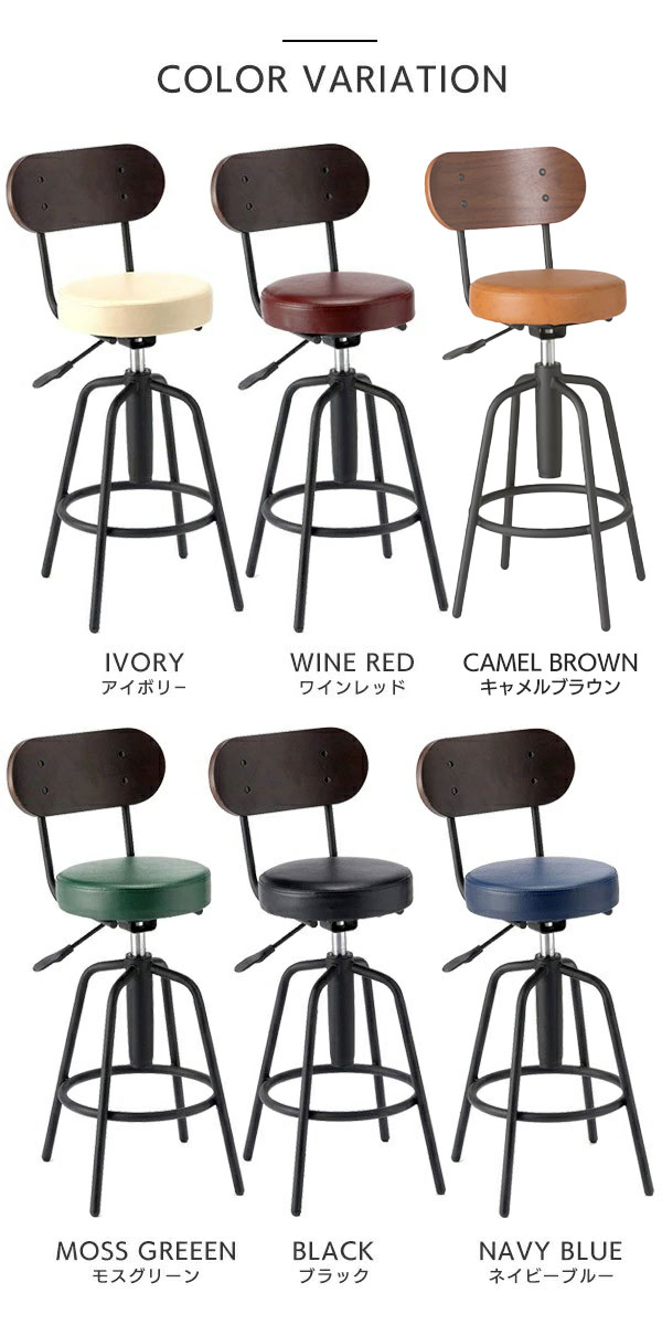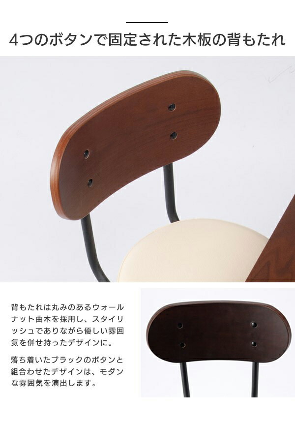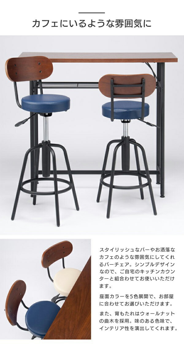 | 商品説明 かっこいい・可愛い・お洒落なカウンターチェアとカウンターテーブルセット。選べる背付き6カラーバリエーションです。背もたれはウォールナットの木板を採用。味のある色目と4つ目のボタンでインテリア性を演出。レバー1つで上下の高さ調整ができますので、ご家庭でのちょっとしたイス、台所での座っての作業、飲食店や受付・待合コーナーにおすすめです。背もたれは2点止めではなく連結フレームと4点止め、座面のウレタンは高密度フォームを採用で耐久性をUP。また、パイプとの接続部分は全て全溶接ですのでしっかり安定しています。(点溶接・スポット溶接ではありません)座から上は360度回転でき、足元は固定タイプですので安心して立ち座りできます。キャスター付きのカウンターチェアと違い、本体が動きませんので身長が低い方でも安心です。 | ||||||||