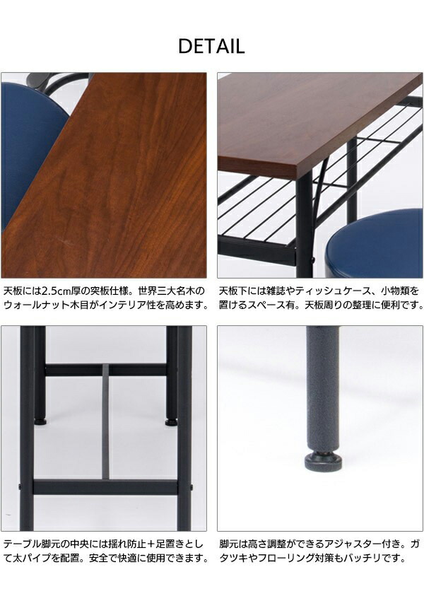 | 材質 【チェア】フレーム:スチール、エポキシ粉体塗装、座面:ウレタンフォーム+合板+PVC、背もたれ:合板ブラウン(ウォールナット柄) ラッカー塗装、【テーブル】フレーム:スチール エポキシ樹脂塗装 アジャスタ付き、天板:突板合板(ウォールナット柄)ラッカー塗装、棚板:スチール エポキシ樹脂塗装 | ||||||||