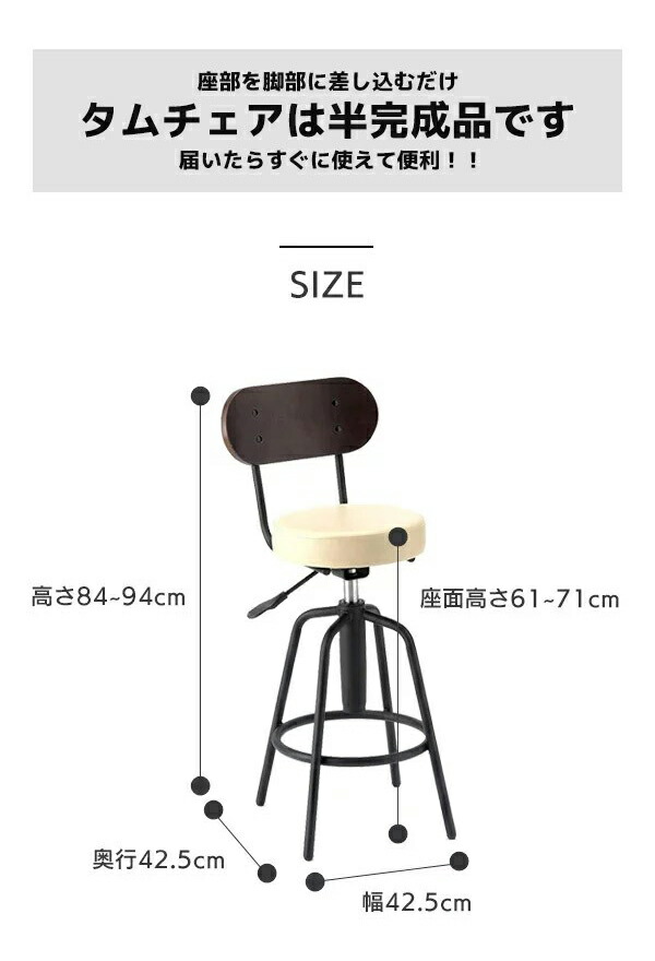 | 商品サイズ 【チェア】全体/幅42.5×奥行42.5×高さ84〜94cm、座面高さ61〜71cm、座面φ28cm(直径) 【テーブル】全体:幅100×奥行35×高さ90.5cm | ||||||||