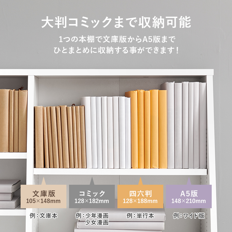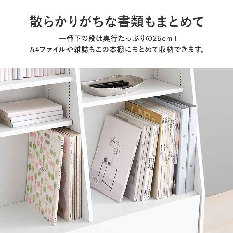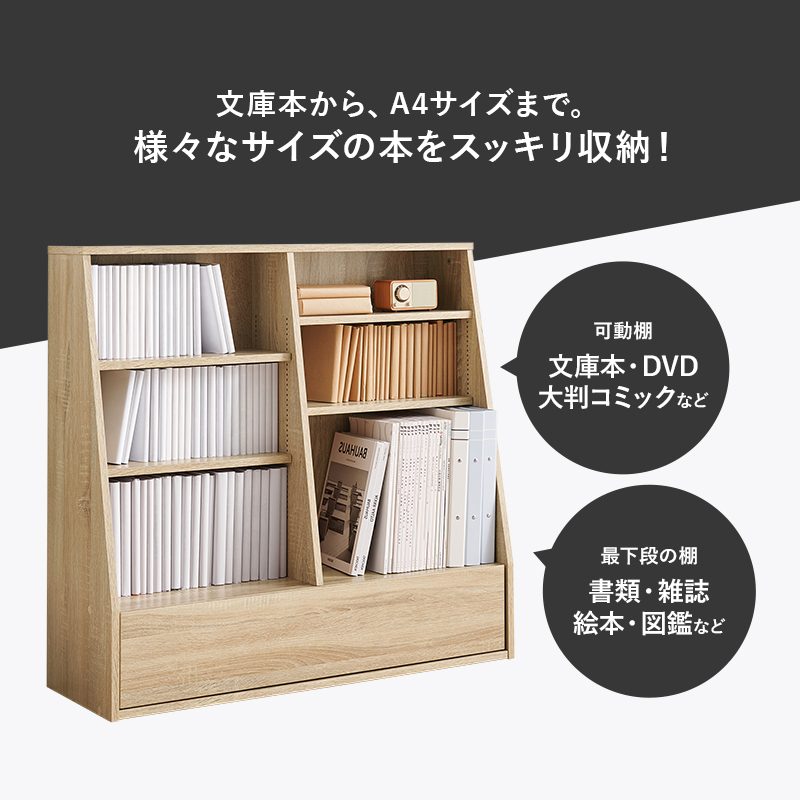 1cmピッチで棚板高さが調節できるシンプルなデザインの本棚。下に行くほど奥行が広くなっており、引出しには日用品の収納もできます。幅90cm