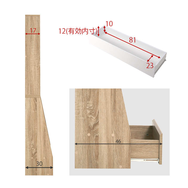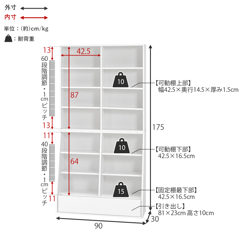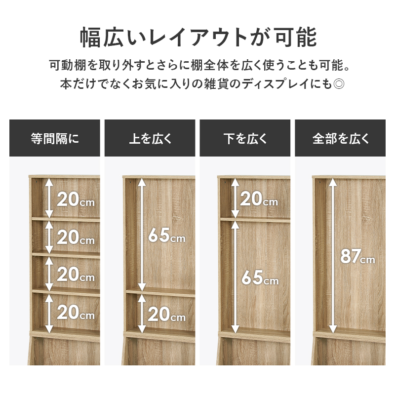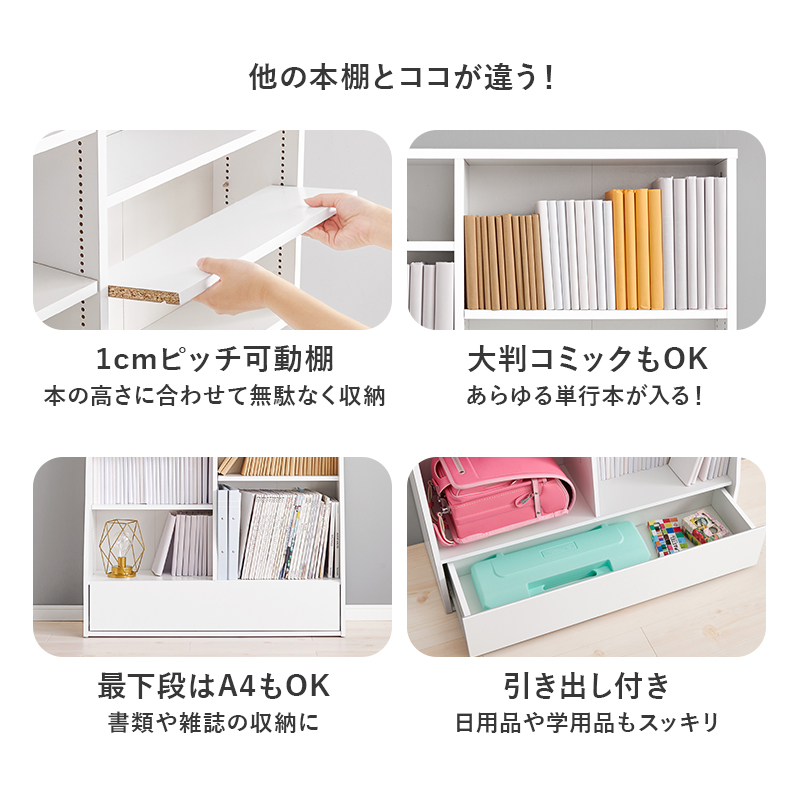 1cmピッチで棚板高さが調節できるハイタイプの大容量本棚。下に行くほど奥行が広くなっており、引出しには日用品の収納もできます。幅90cm